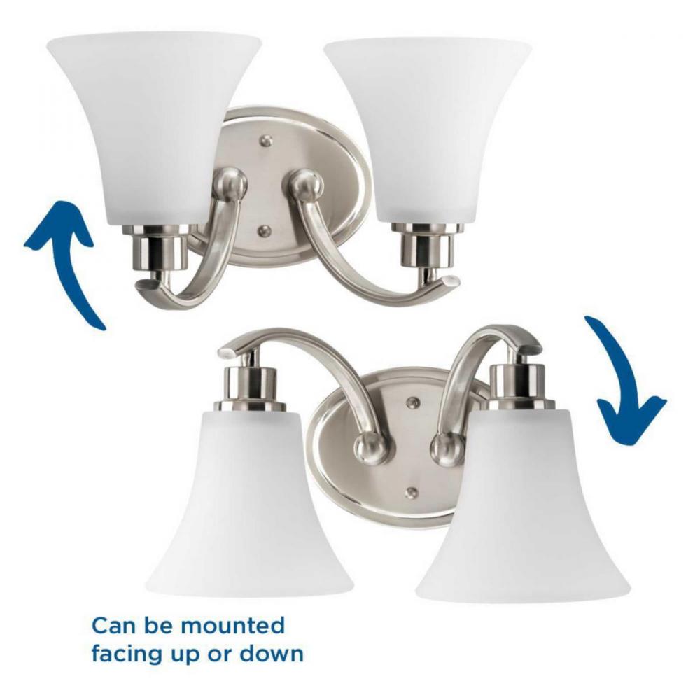 Ideal for a bathroom and powder room.;Perfect for traditional and transitional style settings;Beautiful brushed nickel finish;Elegant etched glass shades;Mount the light fixture facing up or down;Use 2 medium base bulbs that are sold separately (100 W max