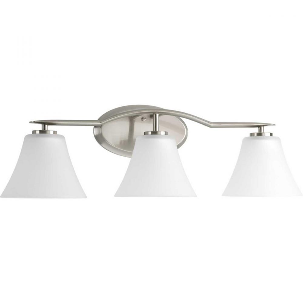 Three-light bath finished in Brushed Nickel with etched glass shades scaled across a slightly arching, pointed arm. Generously balanced glass shades add distinction and provide pleasing illumination to your room. Coordinating fixtures from this collection let you decorate an entire home with confidence and style.