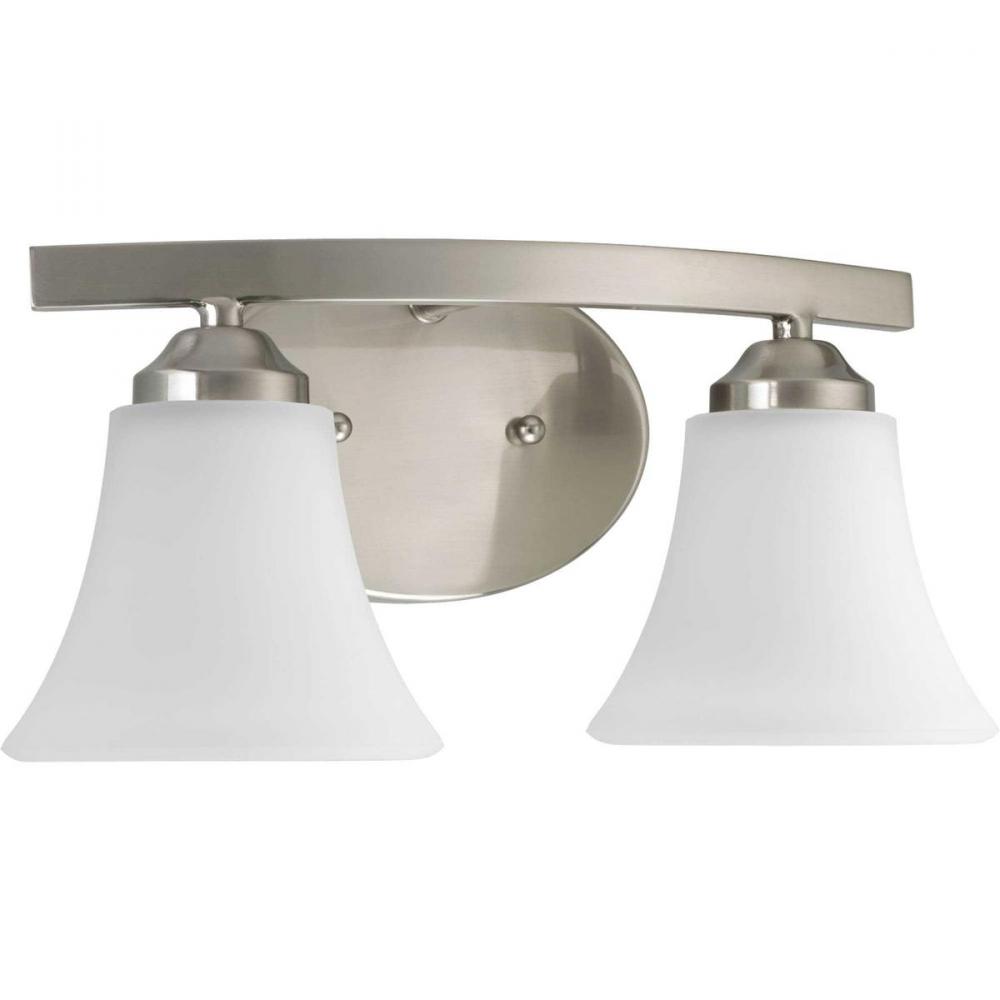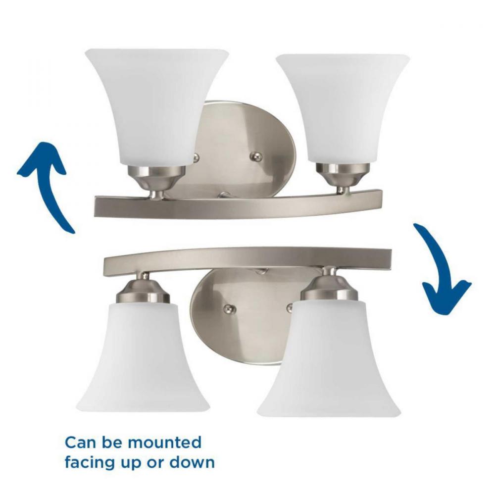 Adorn features a sweeping arced frame that supports elegant, tapered glass shades. This two-light bath fixture is finished in Brushed Nickel with etched glass. It can be installed with shades facing either up or downwards. Adorn coordinates great with the Joy and Bravo families.