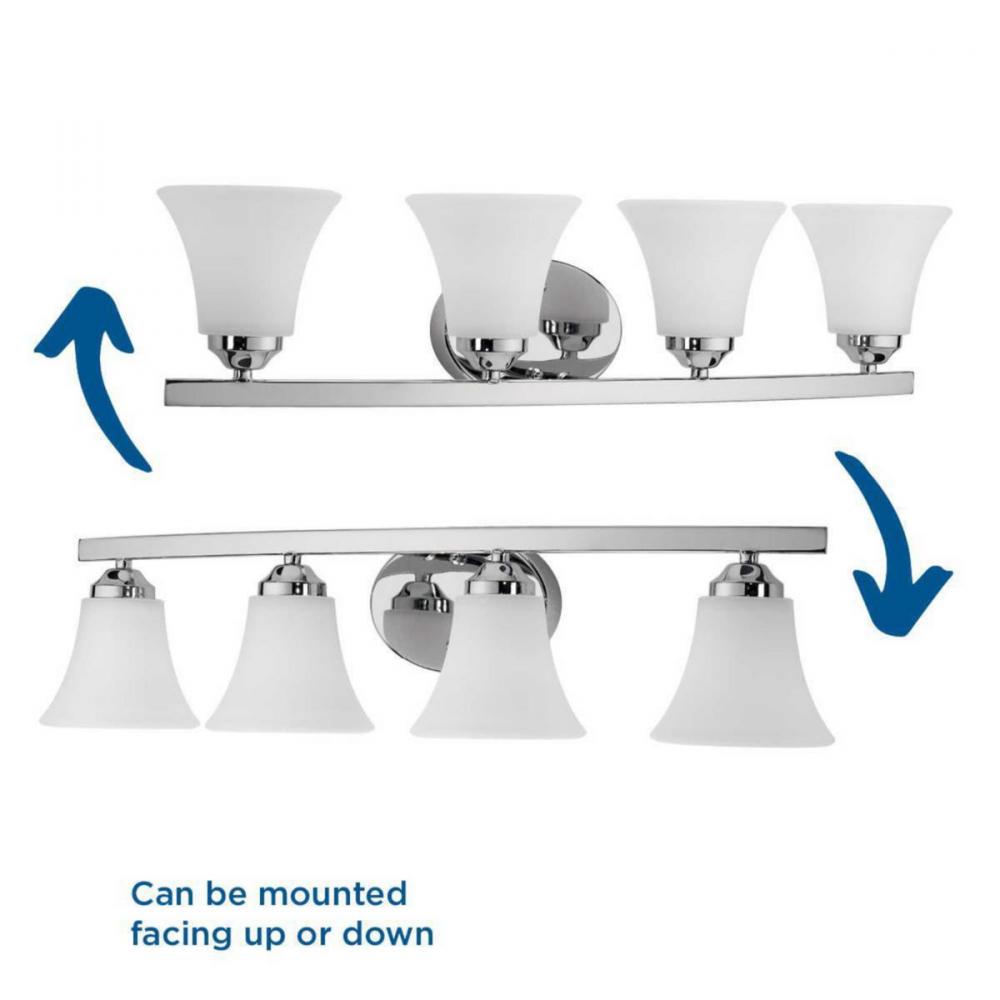 Ideal for a bathroom;Perfect for traditional and transitional style settings;Crisp polished chrome finish;Elegant etched glass shades;Mount the light fixture facing up or down;Use 4 medium base bulbs that are sold separately (100 W max - LED/CFL/incandesce