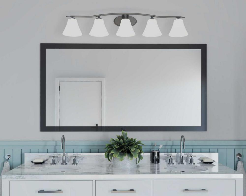 Ideal for a bathroom;Perfect for modern and transitional style settings;Beautiful brushed nickel finish;Elegant etched glass shades;Mount the light fixture facing up or down;Use 5 medium base bulbs that are sold separately (100 W max - LED/CFL/incandescent