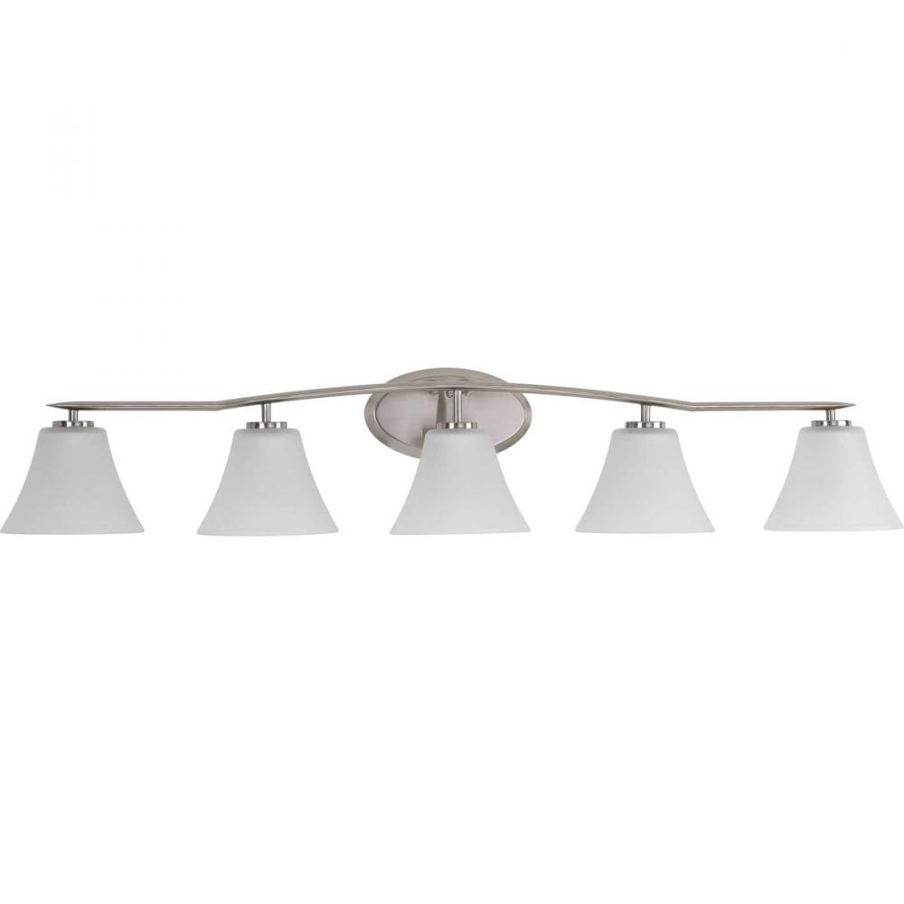 Five-light bath finished in Brushed Nickel with etched glass shades scaled across a slightly arching, pointed arm. Generously balanced glass shades add distinction and provide pleasing illumination to your room. Coordinating fixtures from this collection let you decorate an entire home with confidence and style.