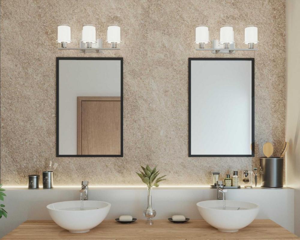 Ideal for a bathroom;Perfect for new traditional, traditional, and transitional style settings;Beautiful brushed nickel finish;Crisp white silk mylar shades over inner etched glass;Includes installation instructions and mounting hardware;Use 3 medium base