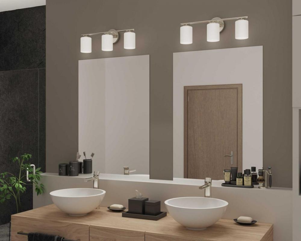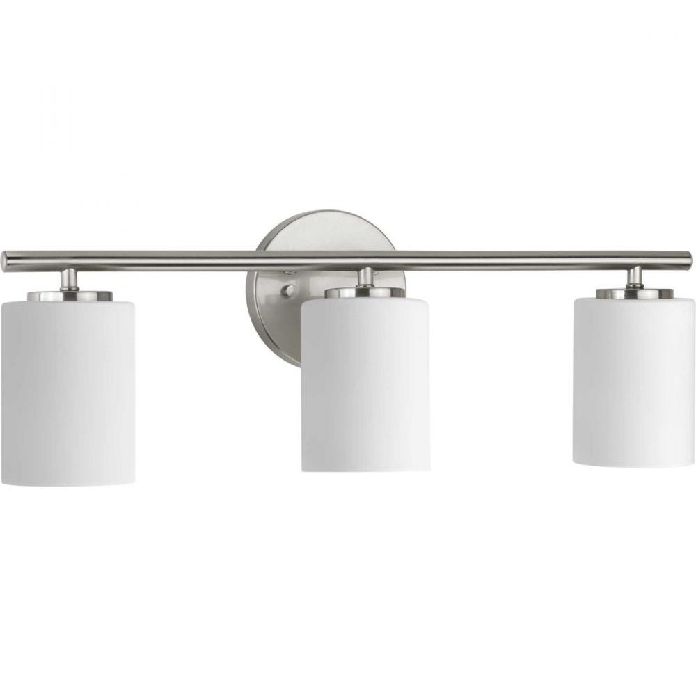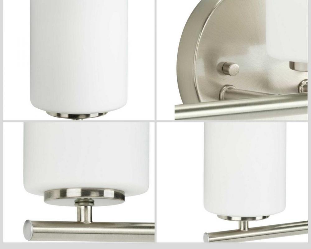 Ideal for a bathroom;Perfect for modern and transitional style settings;Beautiful brushed nickel finish;Elegant etched painted white glass shades;Mount the light fixture facing up or down;Use 3 medium base bulbs that are sold separately (100 W max - LED/CF