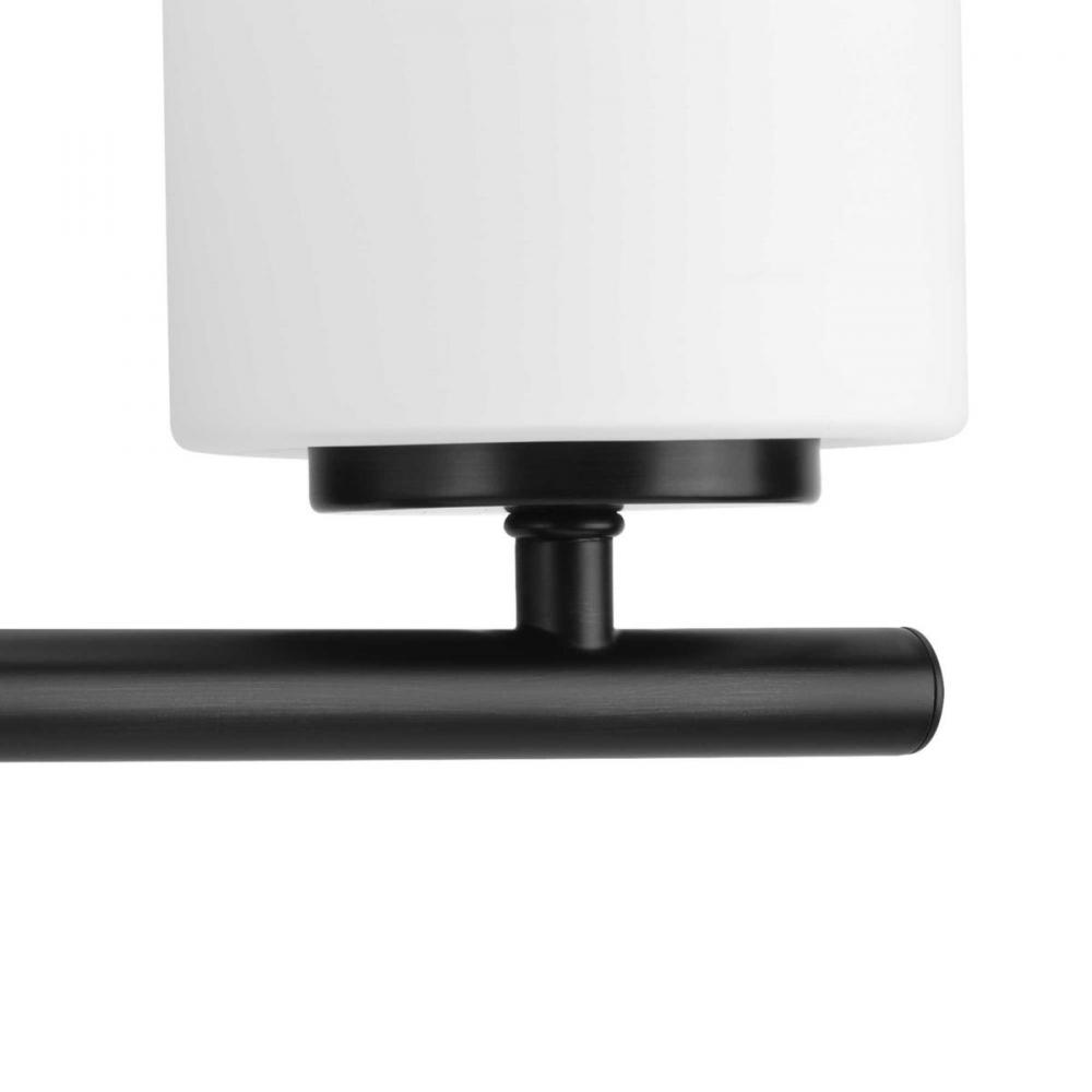 Four-light bath & vanity from the Replay Collection is highlighted by a clean, linear form paired with etched white glass. A pleasingly elegant frame enhances a simplified modern look within the Replay collection. Black finish.