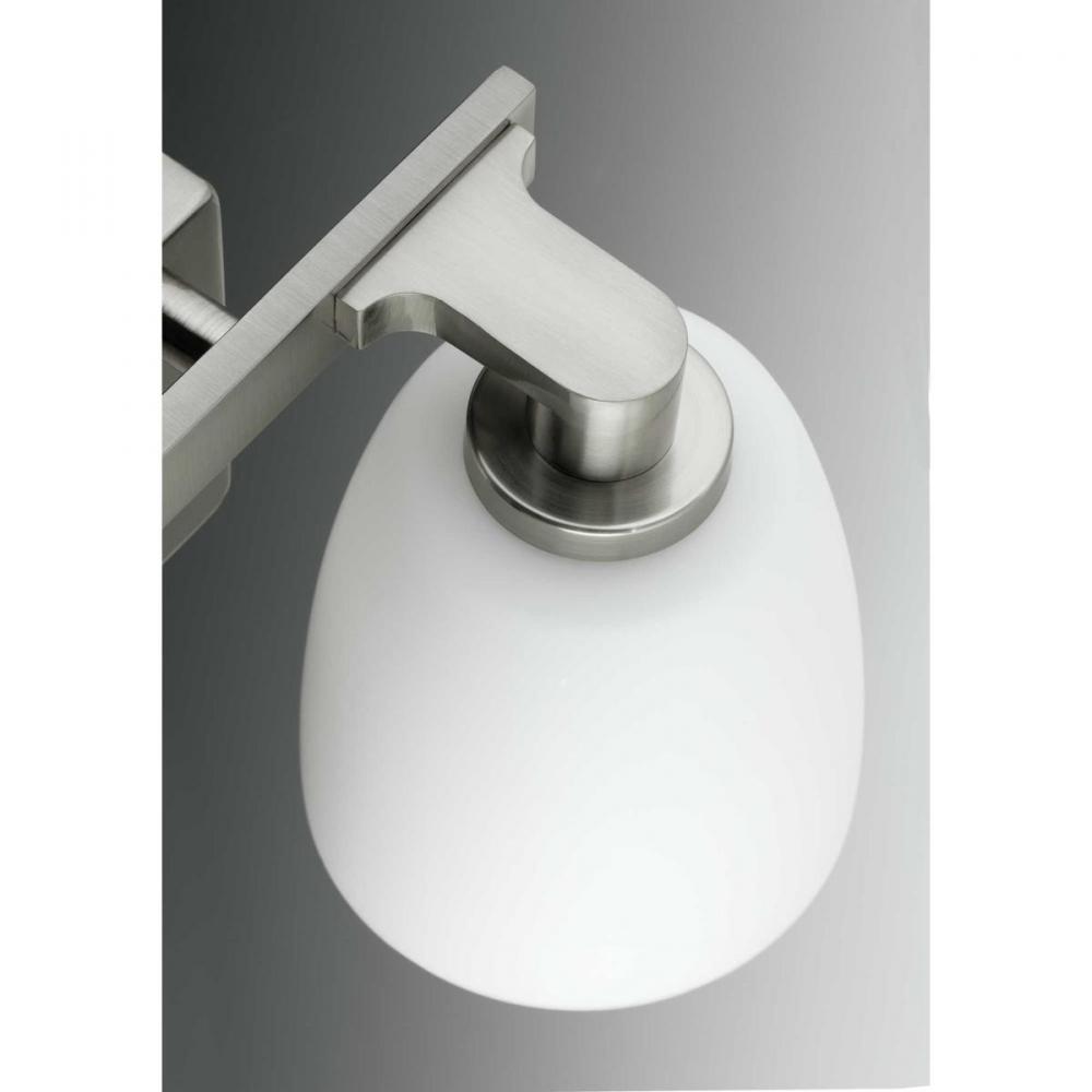 Ideal for a bathroom and powder room.;Perfect for coastal, modern, and transitional style settings;Beautiful brushed nickel finish;Elegant etched opal glass shades;Mount the light fixture facing up or down;Use 2 medium base bulbs that are sold separately (