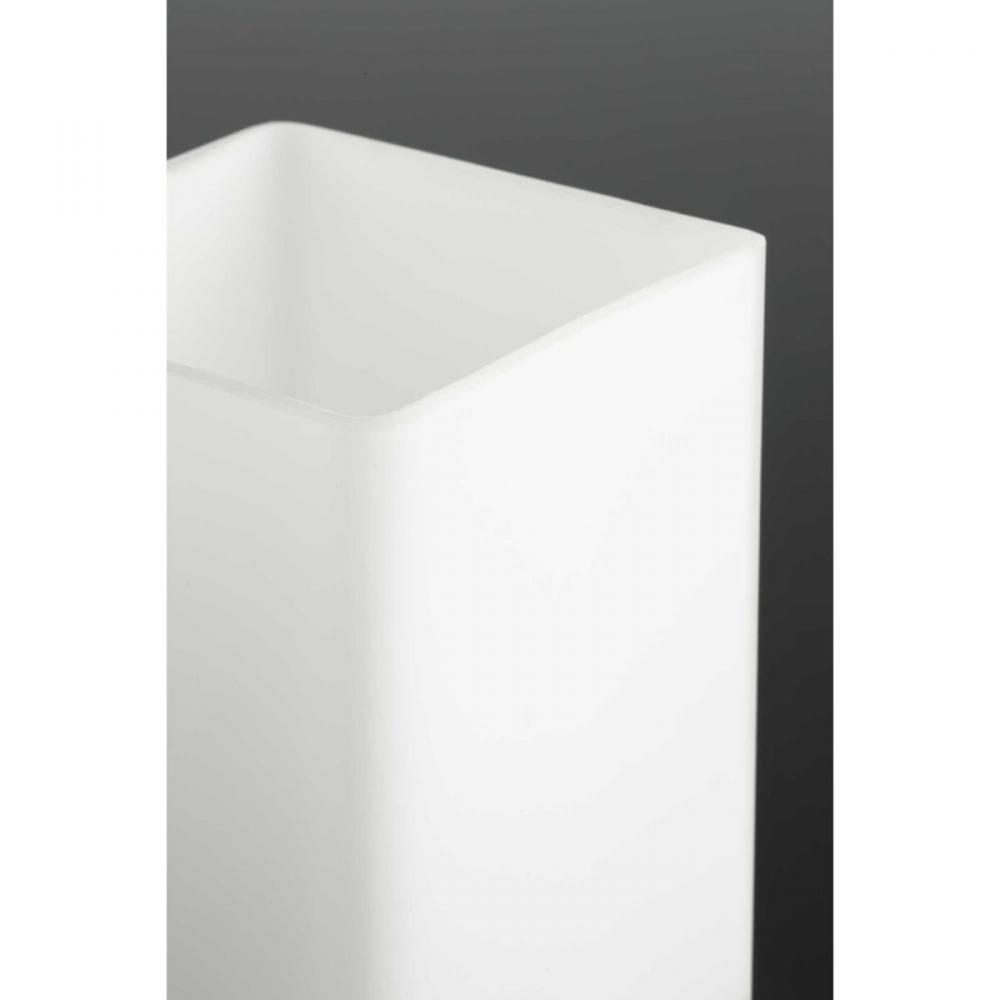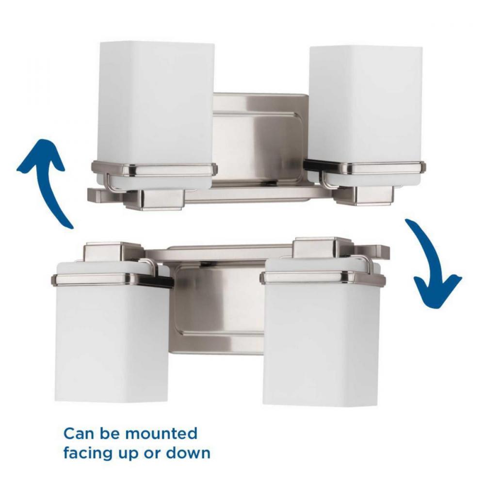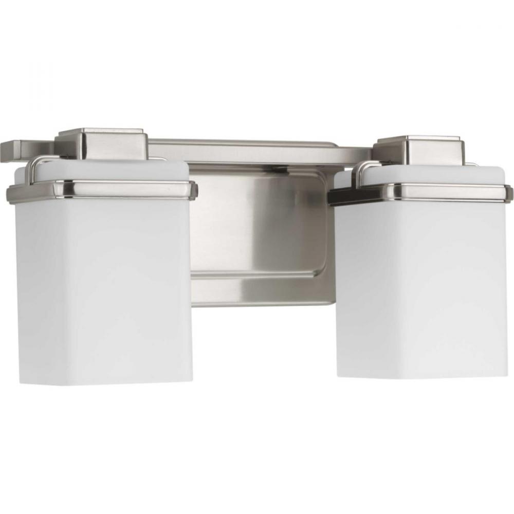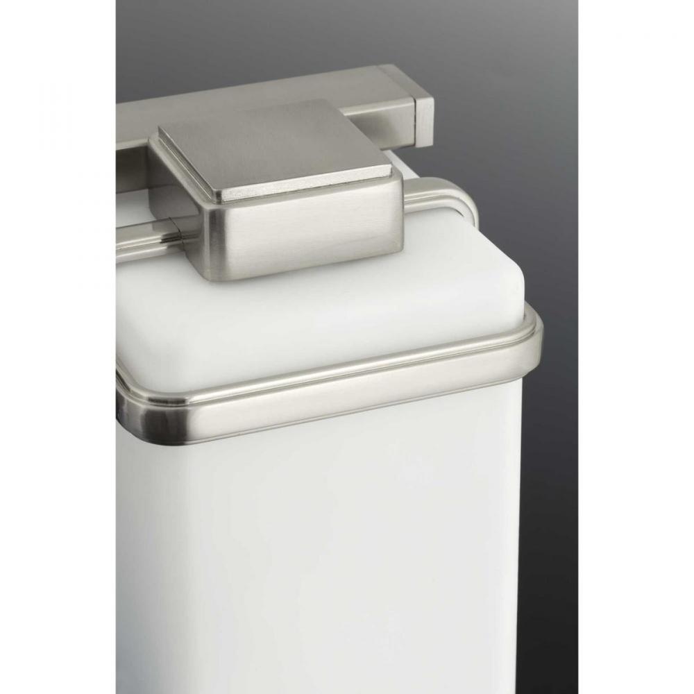 Enjoy a cool and sleek modern design with the two-light bath & vanity in the Metric Collection. A simple, etched opal glass shade nestles inside a die-cast frame - that is finished in Brushed Nickel - providing light above and below the fixture.
