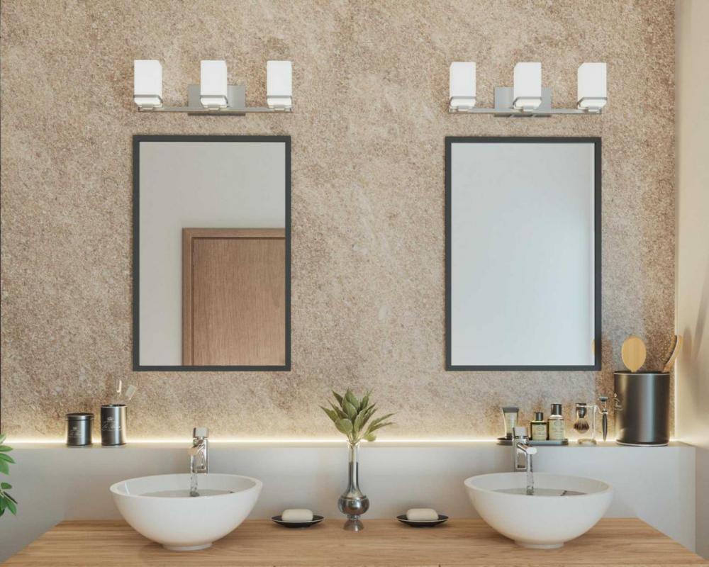 Enjoy a cool and sleek modern design with the three-light bath & vanity in the Metric Collection. A simple, etched opal glass shade nestles inside a die-cast frame - that is finished in Brushed Nickel - providing light above and below the fixture.