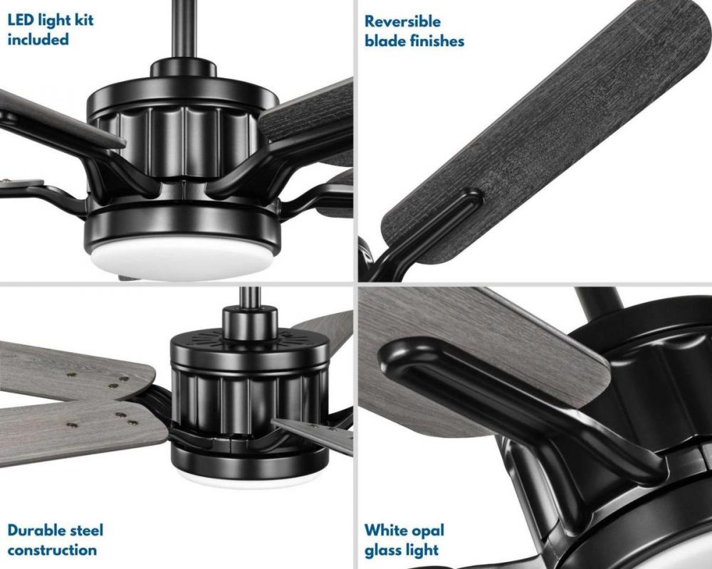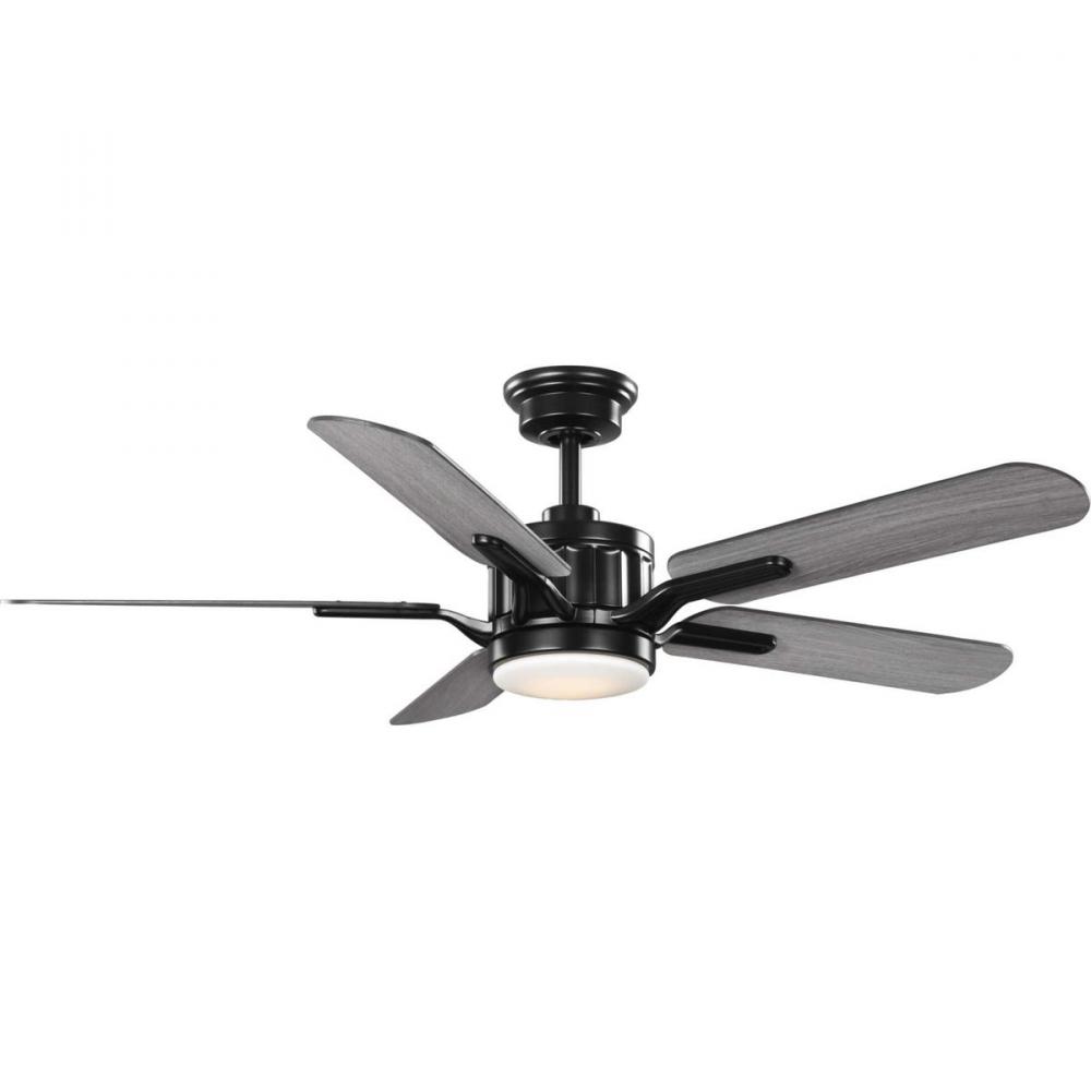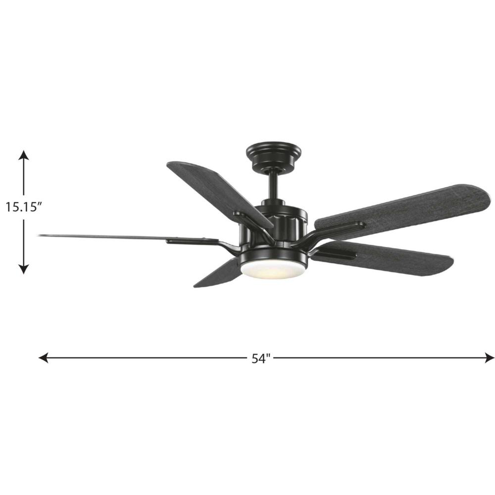Gracefully blend the old with the new with the Claret Collection 5-Blade Reversible Matte Black/American Walnut 54-Inch AC Motor Ceiling Fan. The canopy and fluted AC motor housing are coated in a beautiful black finish and are complemented by reversible distressed ebony and grey weathered wood blades. A 3-speed handheld remote with batteries and a wall bracket for storage are included so you can adjust full-range dimming and fan speed without breaking a sweat. For ideal illumination, an integrated LED source is included (18w max/1,400 lumens per LPW/120v/90 CRI). Dimmable. The ceiling fan's unique take on a classic design is ideal for any living room in transitional style settings. It's time to breathe new life into the mundane every day with timeless and truly transformative lighting. Make your purchase today to begin your journey to a whole new lighting experience. Progress Lighting products are designed for exceptional quality, reliability, and functionality.