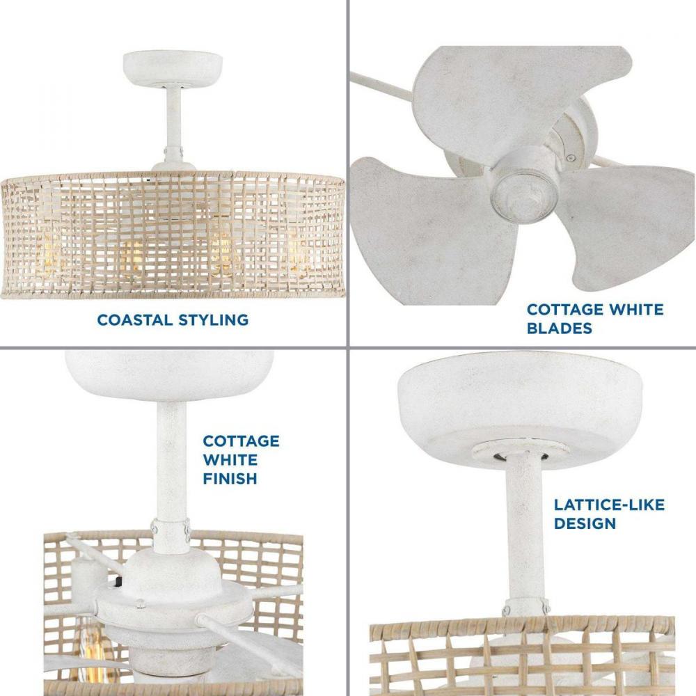Offer an organic global feel with coastal charm with the Belva Collection 25-Inch 3-Blade Cottage White Indoor/Outdoor AC Motor Coastal Ceiling Fan ideal for any great room, bedroom, living room, covered porches or bonus room. Perfect for coastal and global style settings. 3 cottage white blades rotate within the natural wicker frame with a charming lattice-like design.