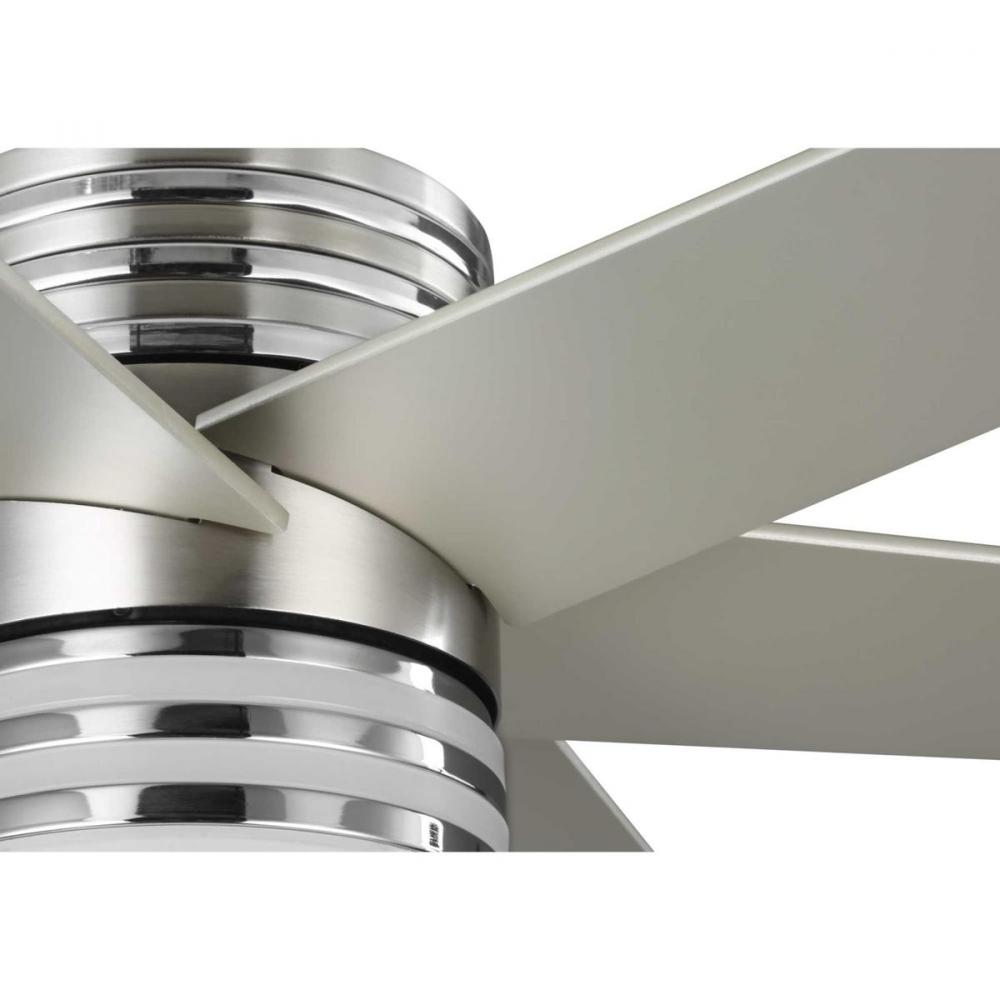Provide a welcomed breeze with a 56" ceiling fan from the Carrollwood Collection. Six reversible plywood blades coated in dual American walnut and silver finishes rotate around a beautiful brushed nickel center with chrome accents for a contemporary aesthetic. An integrated LED module is covered by a shatterproof white opal shade. Dimmable.
