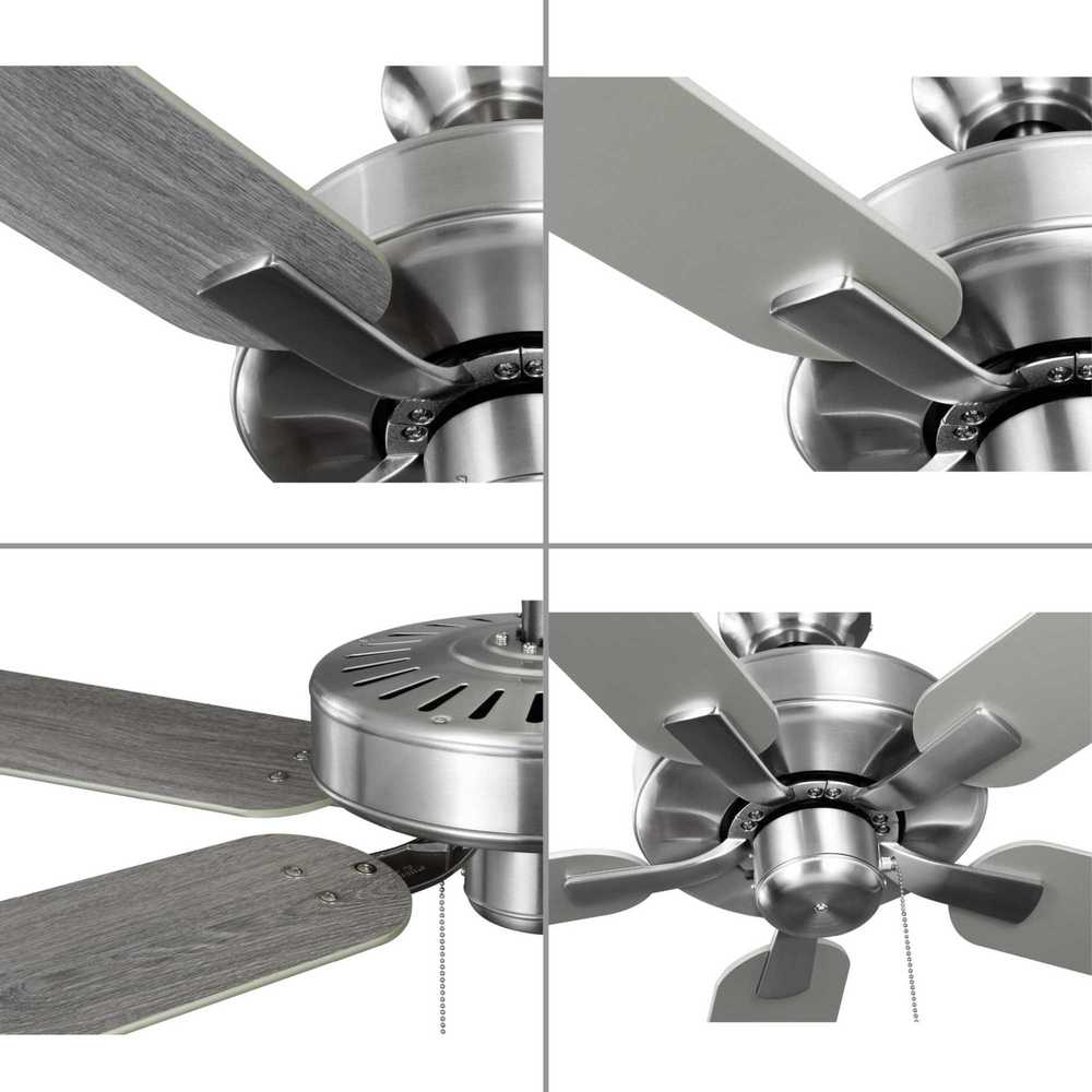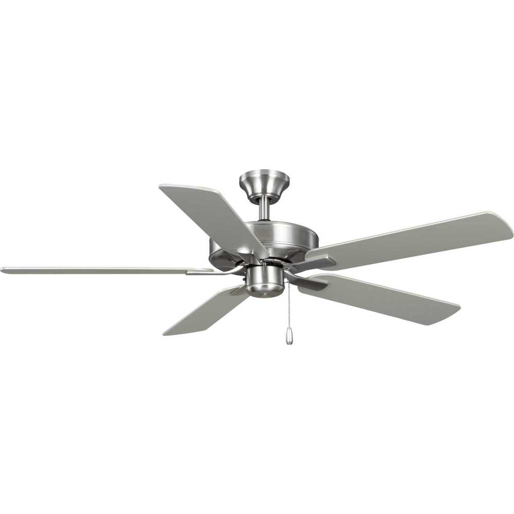 The AirPro 52” 5-blade ceiling fan refreshes interiors with a sleek, modern form coated in a smooth Brushed Nickel finish. Five clean-lined fan blades extend outward from a streamlined motor housing that contains a powerful AC motor. Its versatile yet timeless design makes it ideal for a wide range of interior décor styles. The fan has an AC motor for maximum efficiency. An accessory universal light kit, wall or remote control can be added (sold separately). The fan can be installed on a flat or sloped ceiling. The blade arms have Captive Screws allowing for easier installation.