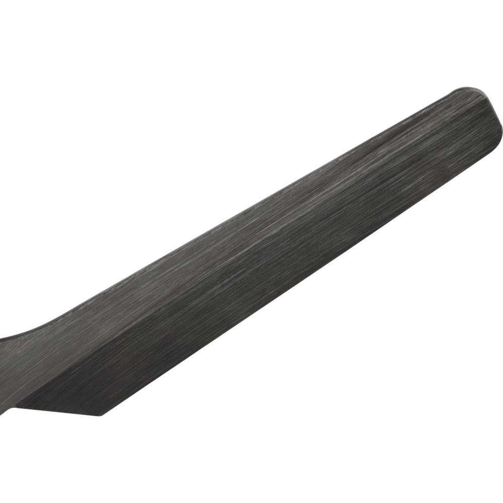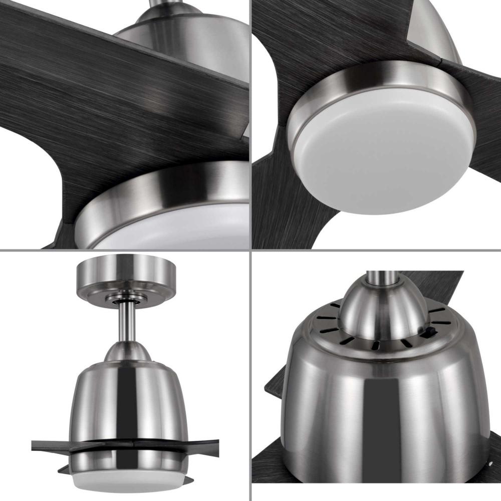 3 sleek blades finished in grey weathered wood extend from a housing coated in a smooth brushed nickel finish