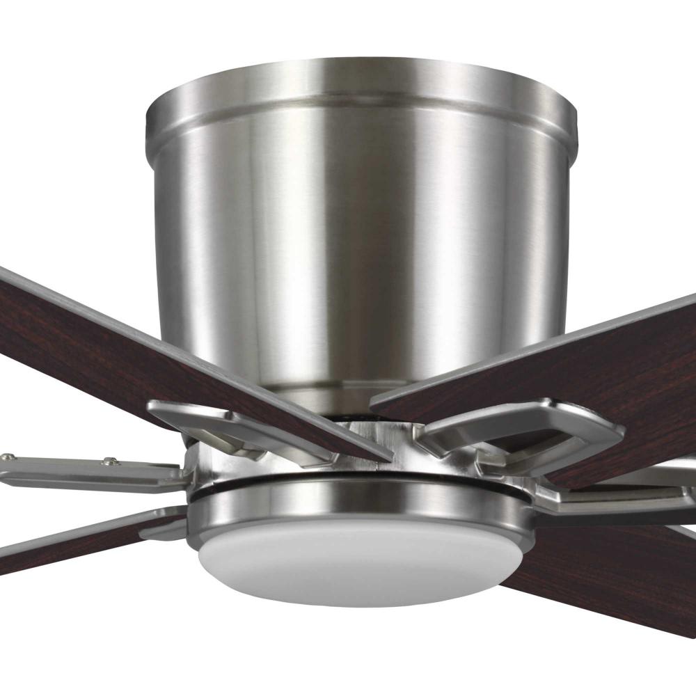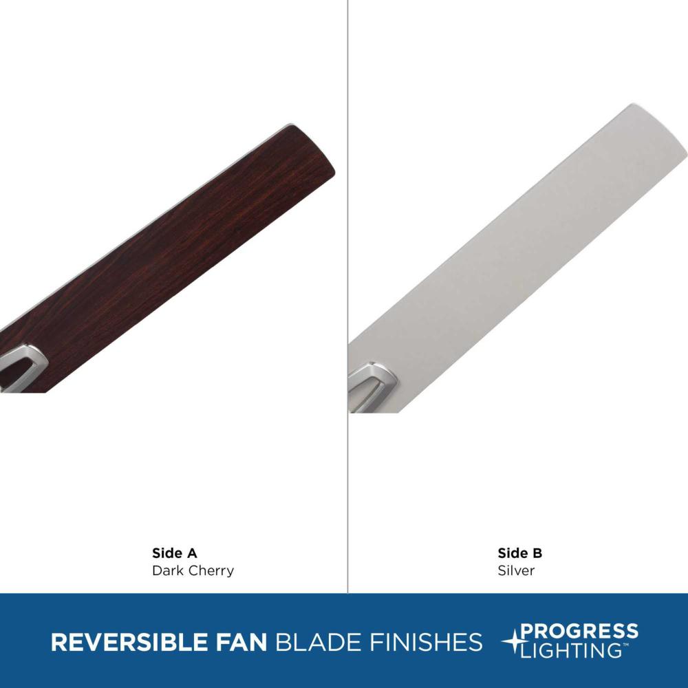 The fan is finished in subtle brushed nickel and features six reversible blades coated in silver and dark cherry finish
