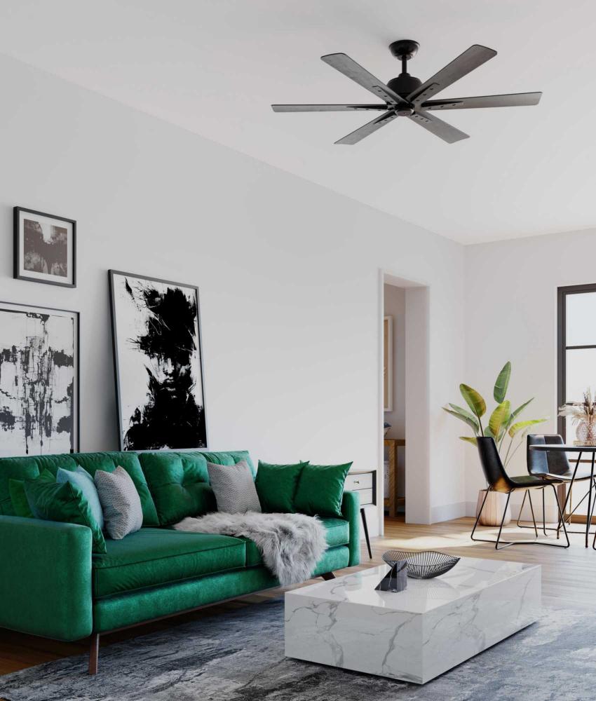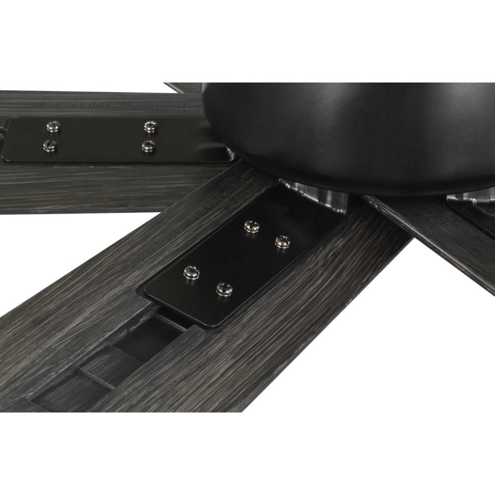 The fan is finished in matte black complemented by six all-weather ABS blades in distressed ebony finish