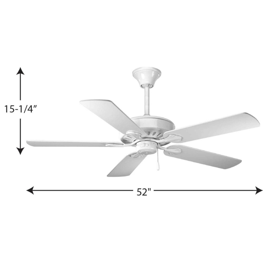 52" Performance fan includes 5 White blades, White finish, and lifetime limited warranty. Powerful AirPro motor features 3-speed control that can also be reversed to provide year-round comfort. Standard canopy is designed for sloped ceilings with 12:12 pitch. Sure Connect blade attachment system and 3/4" x 6" downrod are also included. Can be used to comply with California Title 20.