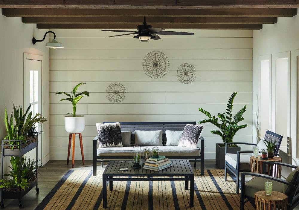 60" Montague indoor/outdoor ceiling fan features a spacious design with five blades;The white opal glass shade contains a 18W dimmable, 3000K LED module, 90+ CRI and 1400 lumens (source) - offering both form and function with energy- and cost-savings b