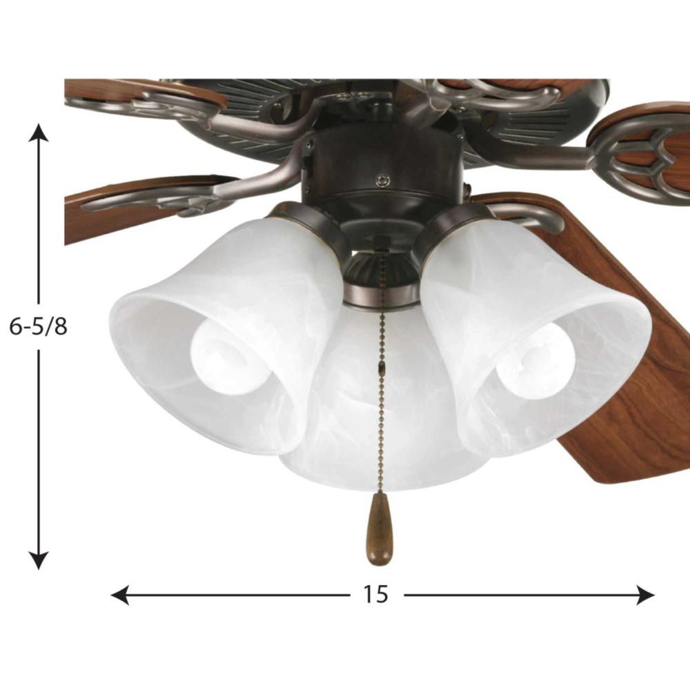 Three-light kit with white washed alabaster style glass shades beautiful in design. Antique Bronze finish corresponds with an Antique Brass pull-chain and medium oak fob. Innovative spring clip glass attachment system eliminates unsightly excess hardware. Good for use with P2500 and P2501 ceiling fans and includes quick connector for easy wiring. Includes three 3000K, 800 lumen, Title 24 certified LED bulbs.