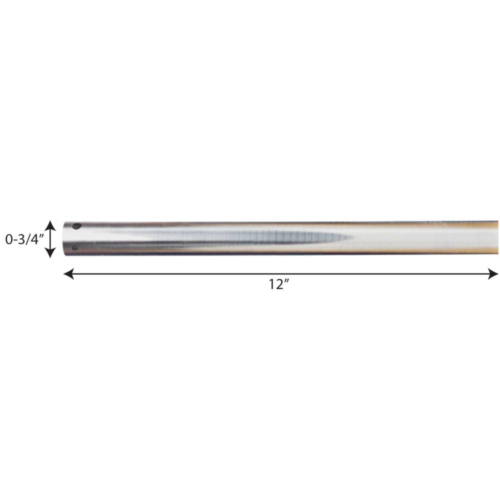 3/4 In. x 12 In. downrod for use with any Progress Lighting ceiling fan. Use of a fan downrod positions your ceiling fan at the optimal height for air circulation and provides the perfect solution for installation on high cathedral ceilings or in great rooms. Refer to the selection guide for recommended downrod lengths based upon your ceiling height. Brushed Nickel finish.