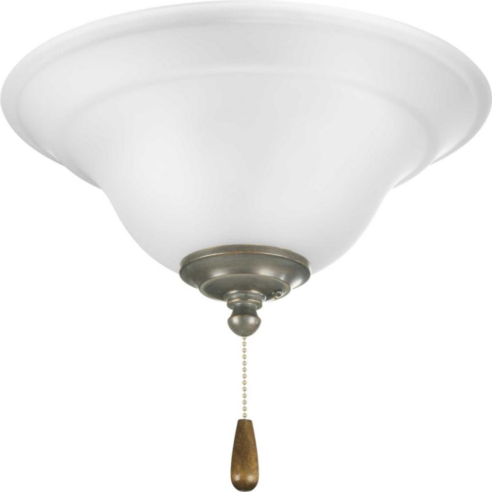 Two-light fan kit with an etched glass bowl from the Trinity Collection. Finials included are -09 Brushed Nickel, -20 Antique Bronze, -30 White and -77 Forged Bronze that match a variety of Progress Lighting fans. Quick-connect wiring makes it easy to install to a fan that accept an accessory light. Gracefully exotic, the Trinity Collection offers classic sophistication for interiors. Includes two 3000K, 800 lumen each (source), Title 24 certified LED bulbs.