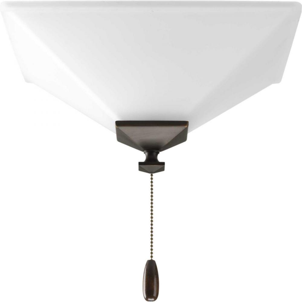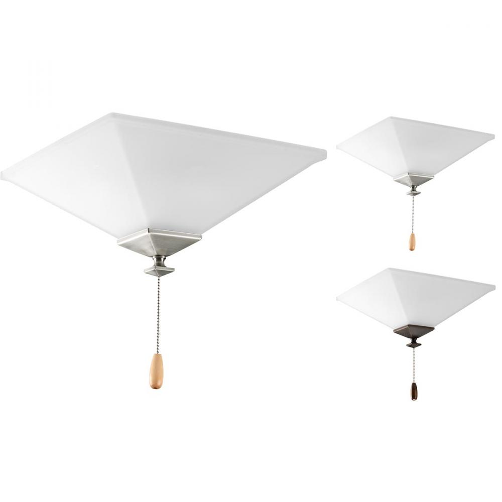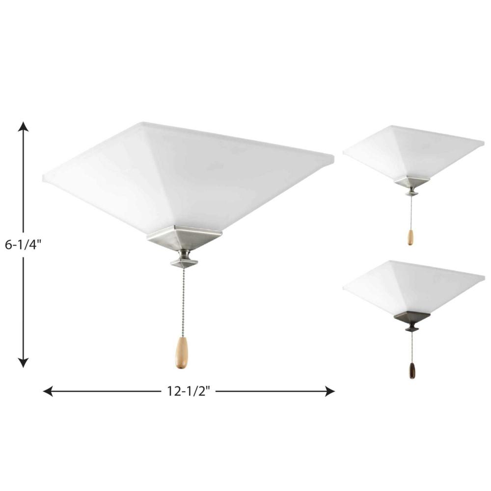 Add style and light to your ceiling fan with this universal fan light kit.;White, squared escutcheon and finial support etched glass.;Finials included are -09 Brushed Nickel, and -20 Antique Bronze.;Quick-connect wiring to any progress fan that accept an a