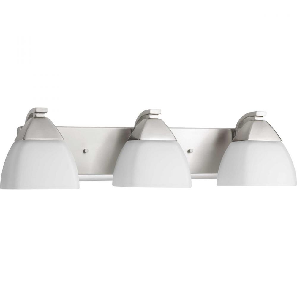 Three-light bath with distinctive forms that highlight soft modern accents. Etched white glass shades balance nicely with the fixture's full back plate and simple square arms, contributing to a desired spa-like effect. Brushed Nickel finish.