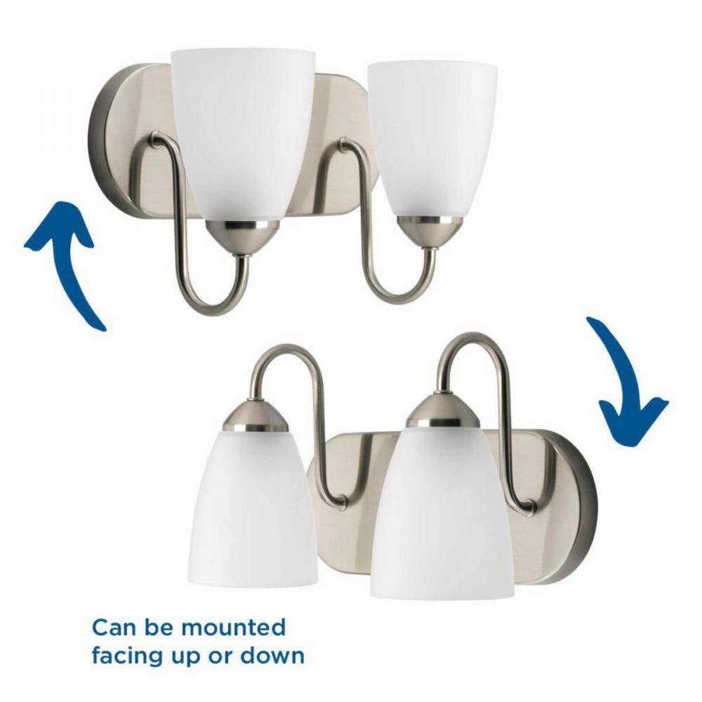 Ideal for a bathroom and powder room.;Perfect for traditional and transitional style settings;Beautiful brushed nickel finish;Elegant etched glass shades;Mount the light fixture facing up or down;Use 2 medium base bulbs that are sold separately (100 W max