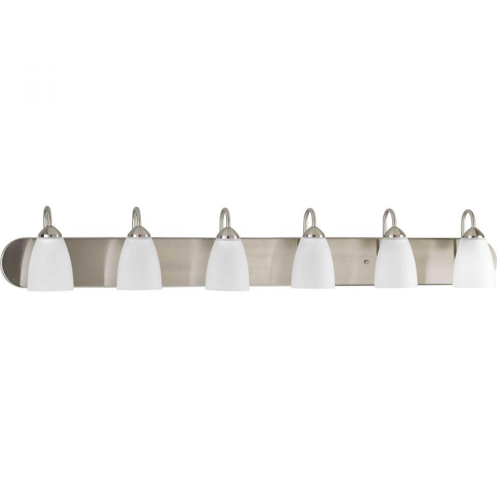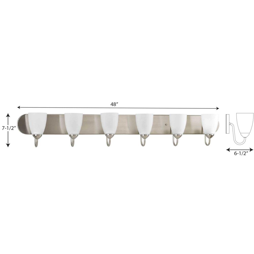 Gather possesses a smart simplicity to complement today's home. This six-light bath bracket contains etched glass shades which add distinction and provide pleasing illumination to your room. Featuring a glamorous Brushed Nickel finished frame, this collection allows you to decorate an entire home with confidence and style.