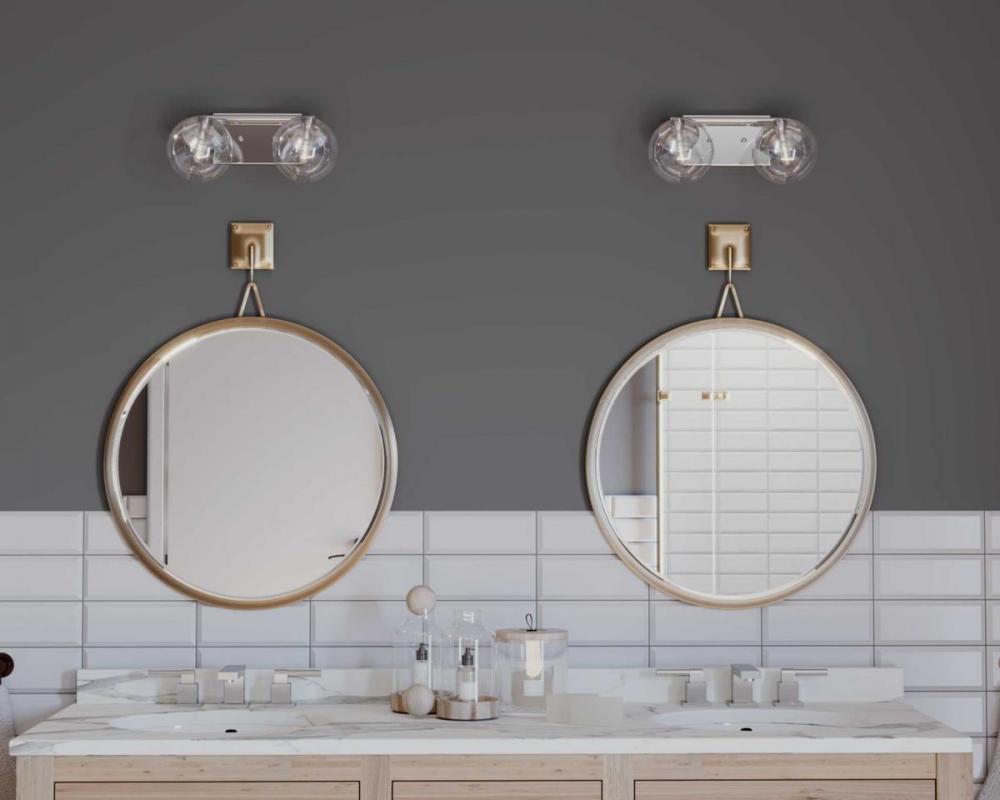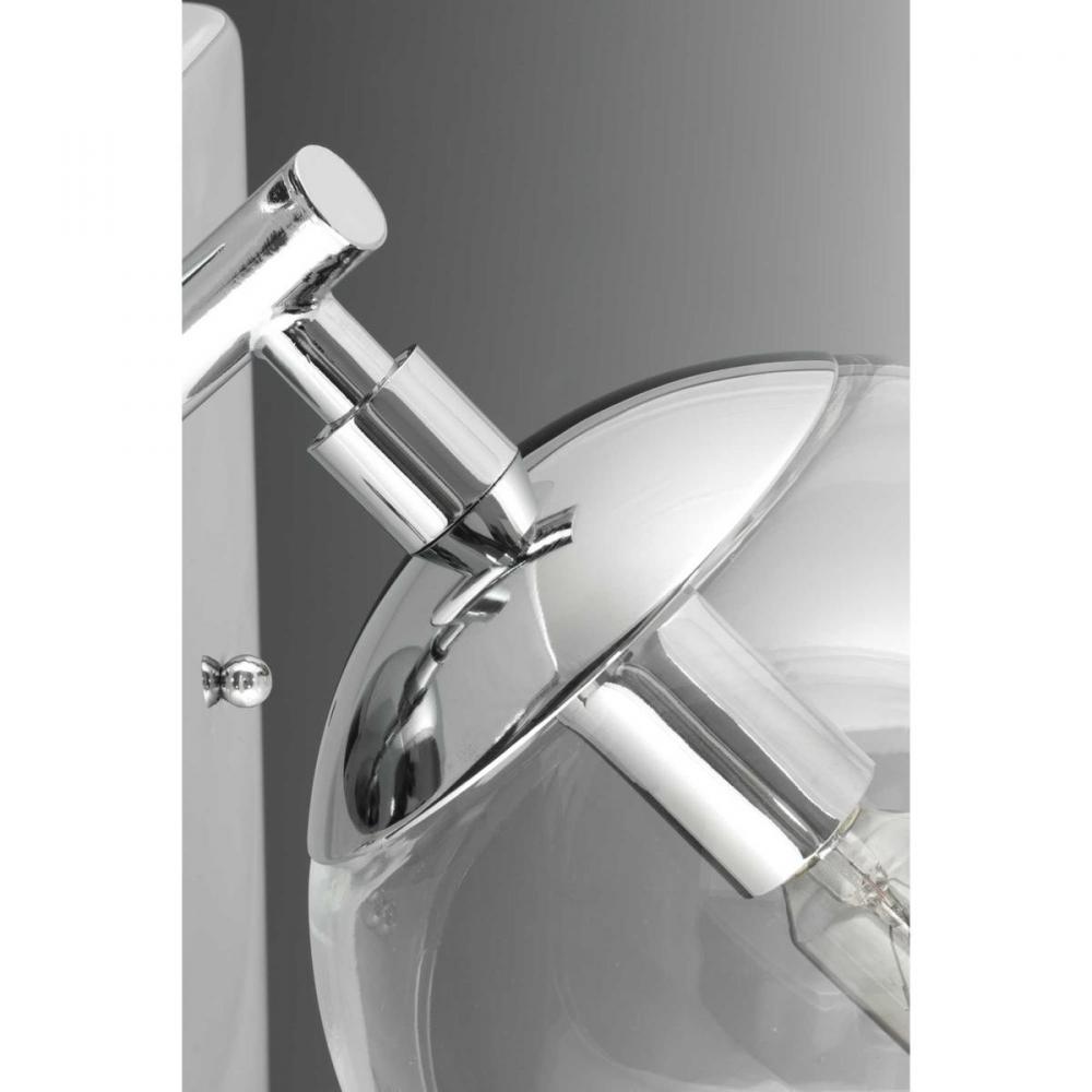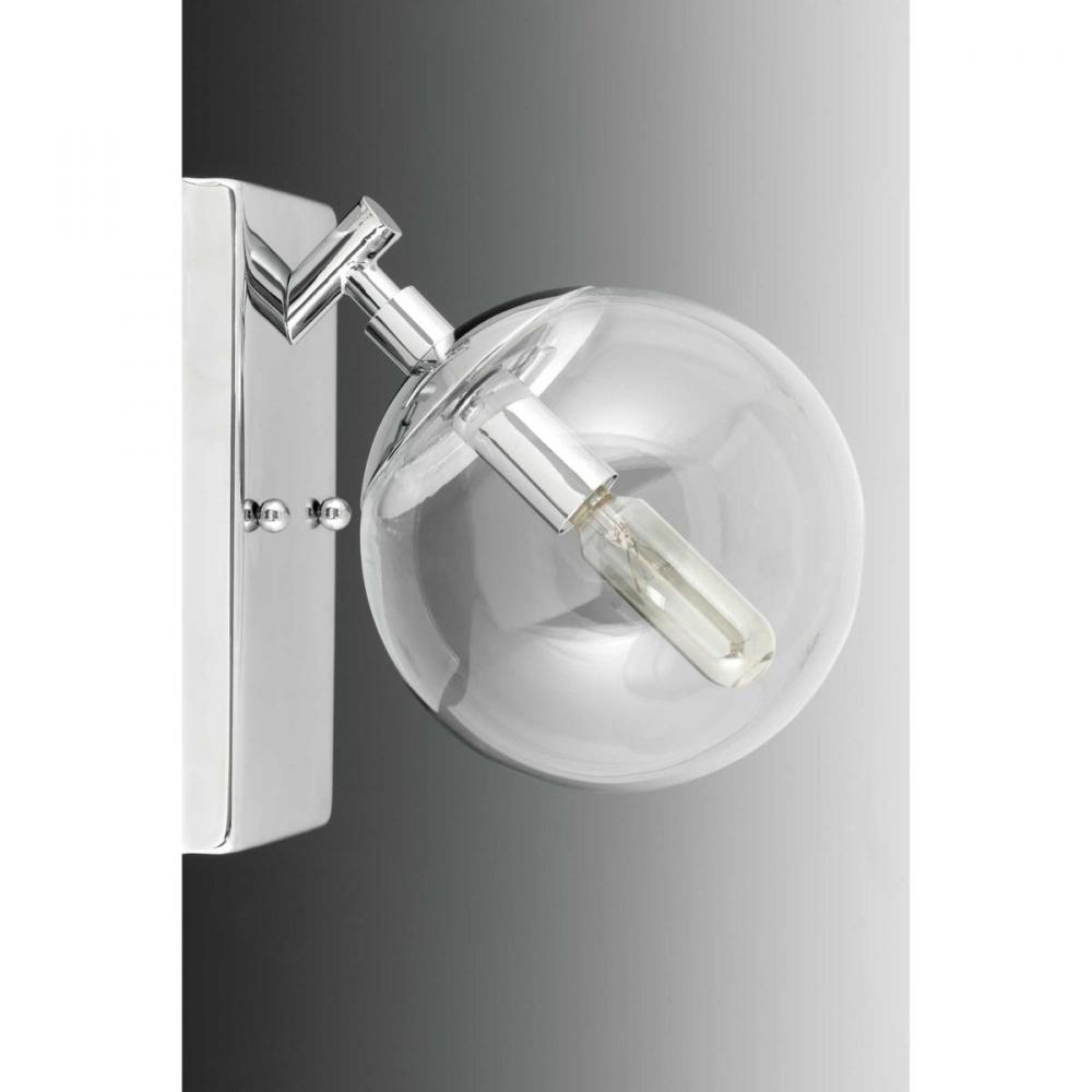 Giving a nod to the space age with mid-century modern appeal, Mod features a sleek linear frame in a Polished Chrome finish. Clear, spherical glass shades offer the perfect focal point for vintage bulbs or reflector-style globes. This two-light fixture can be used in the bath and vanity or as a complimentary wall sconce.