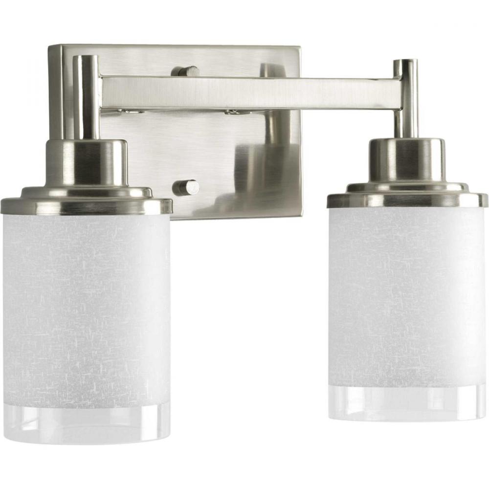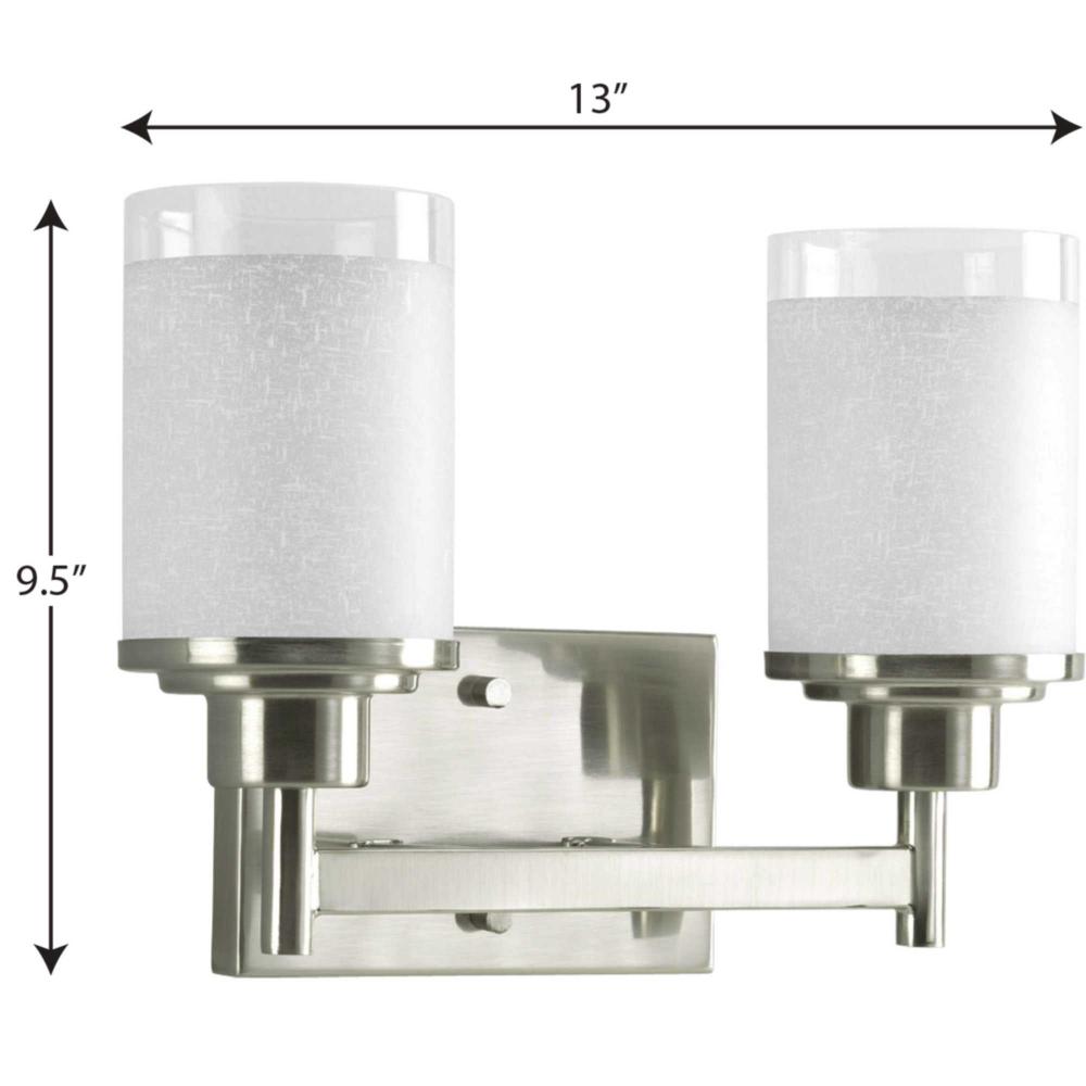 Ideal for a bathroom and powder room.;Perfect for modern and transitional style settings;Beautiful brushed nickel finish;Elegant etched linen glass shades with clear edge;Mount the light fixture facing up or down;Use 2 medium base bulbs that are sold separ