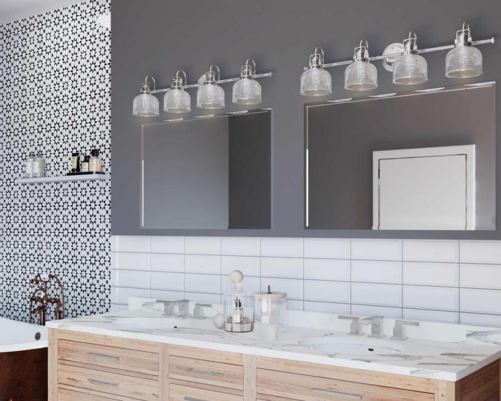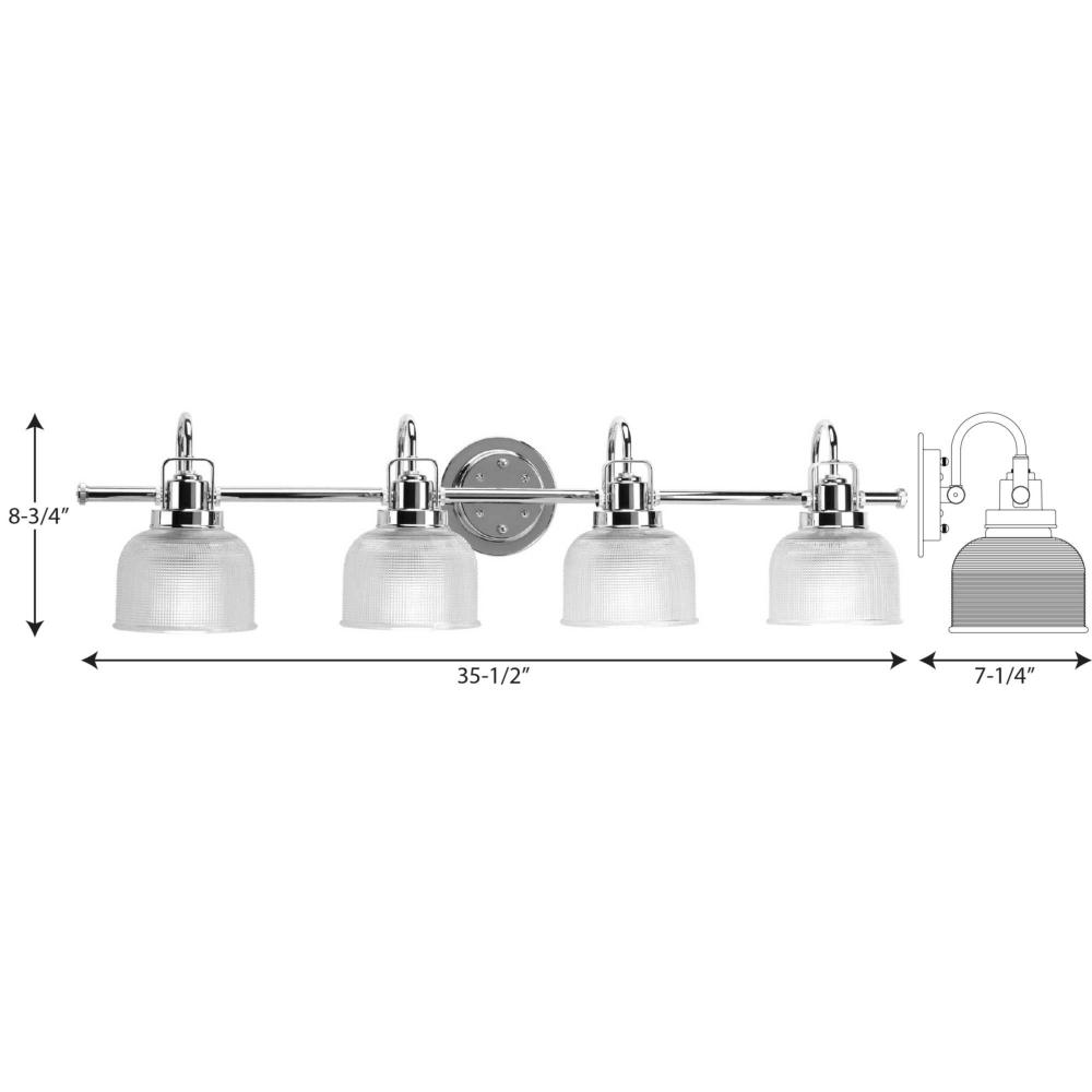 Ideal for a bathroom;Perfect for coastal, farmhouse, transitional, and vintage electric style settings;Crisp polished chrome finish;Stunning clear double prismatic glass shades;Mount the light fixture facing up or down;Use 4 medium base bulbs that are sold