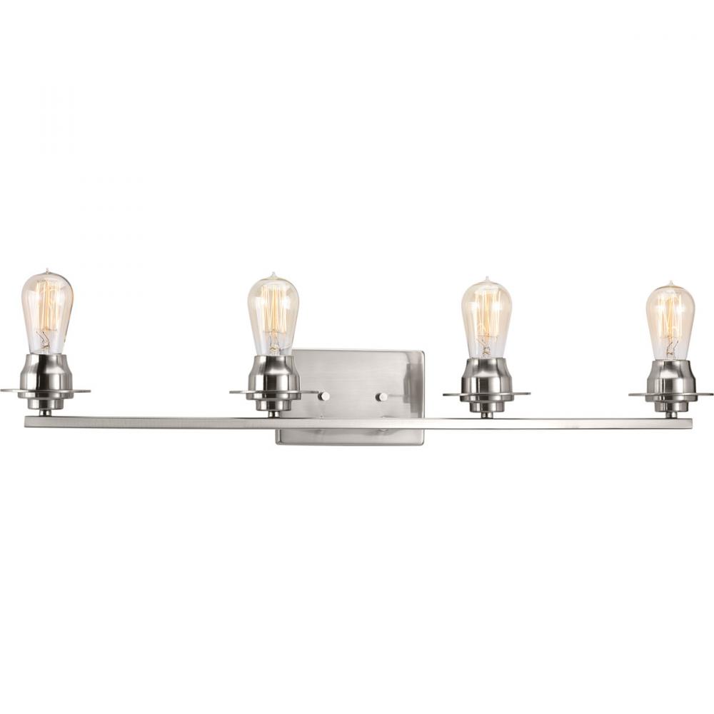 A new category of vintage modern fixtures takes center stage with this four-light bath & vanity fixture from one of our Design Series collections. Delicate details in a Brushed Nickel finish, create statement making focal pieces for a variety of interiors. Debut provides a fitting stage to feature nostalgic, vintage lamps. Glass accessory shades available in clear or frosted seeded finishes.