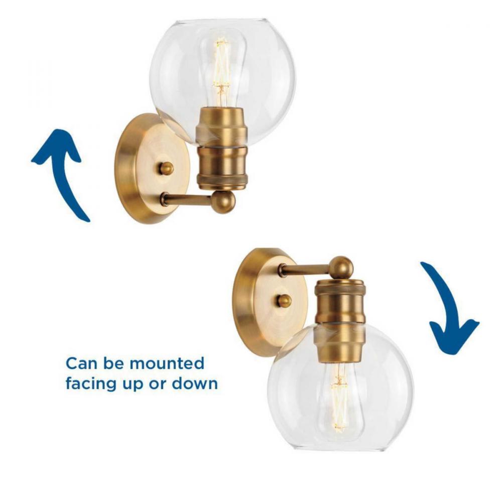 Ideal for a bathroom, hall, bedroom, or foyer;Perfect for farmhouse, transitional, and coastal style settings;Golden vintage brass finish;Round clear glass shade;Mount the light fixture facing up or down;Use 1 medium base base bulb that is sold separately