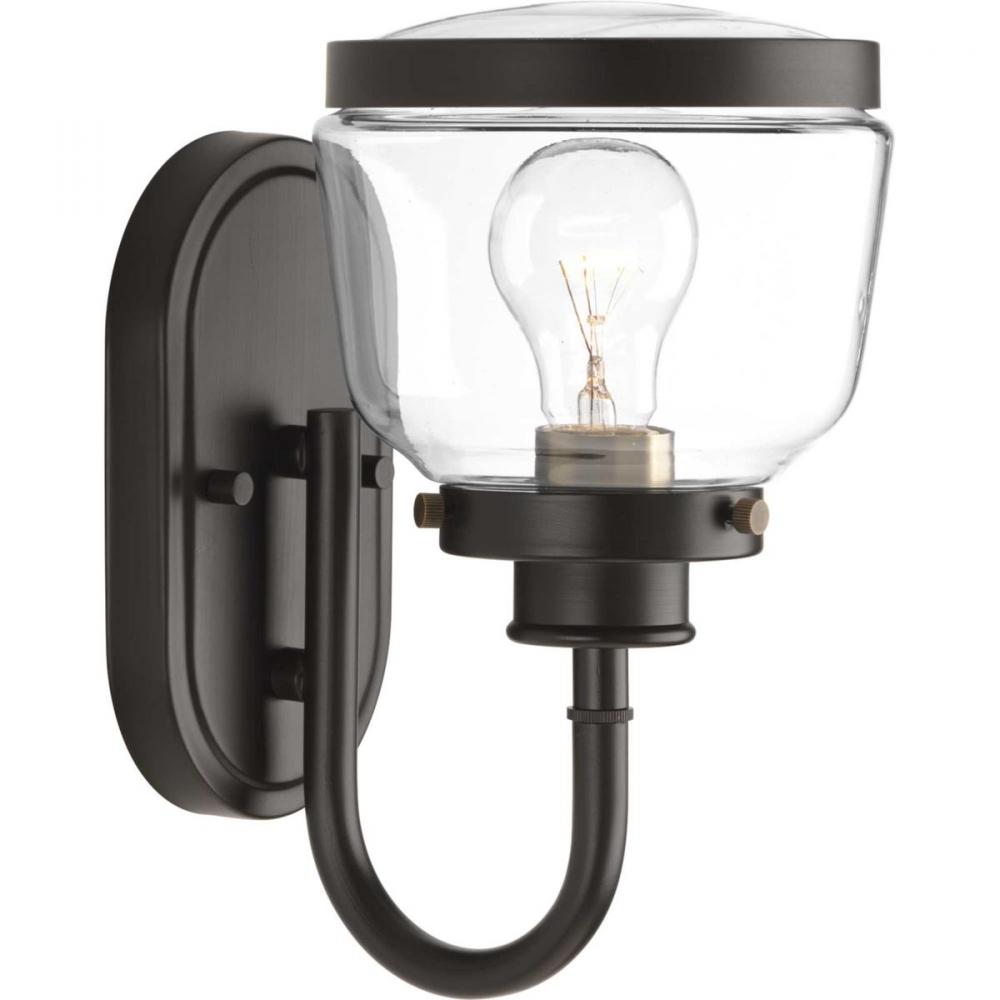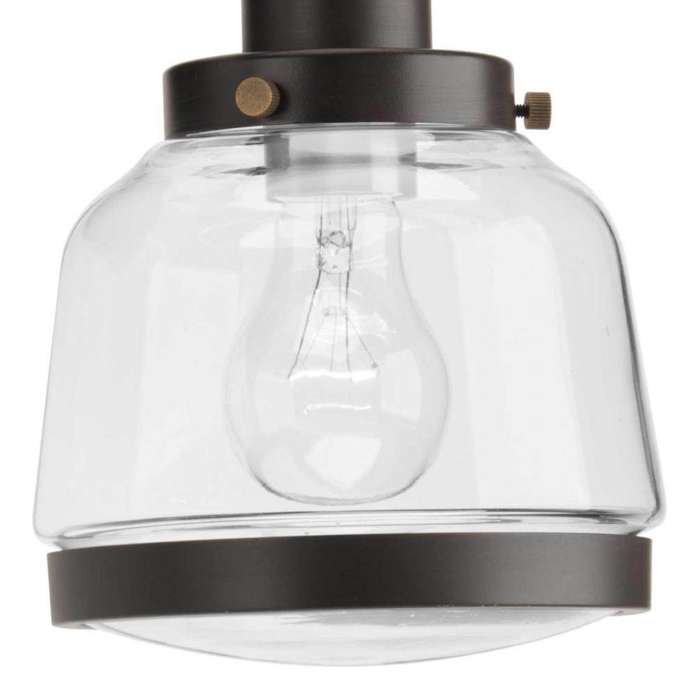 Ideal for a bathroom, dining room, hallway, or foyer;Perfect for farmhouse and vintage electric style settings;Handsome antique bronze finish;Crisp clear glass shade;Mount the light fixture facing up or down;Use 1 medium base bulb that is sold separately (