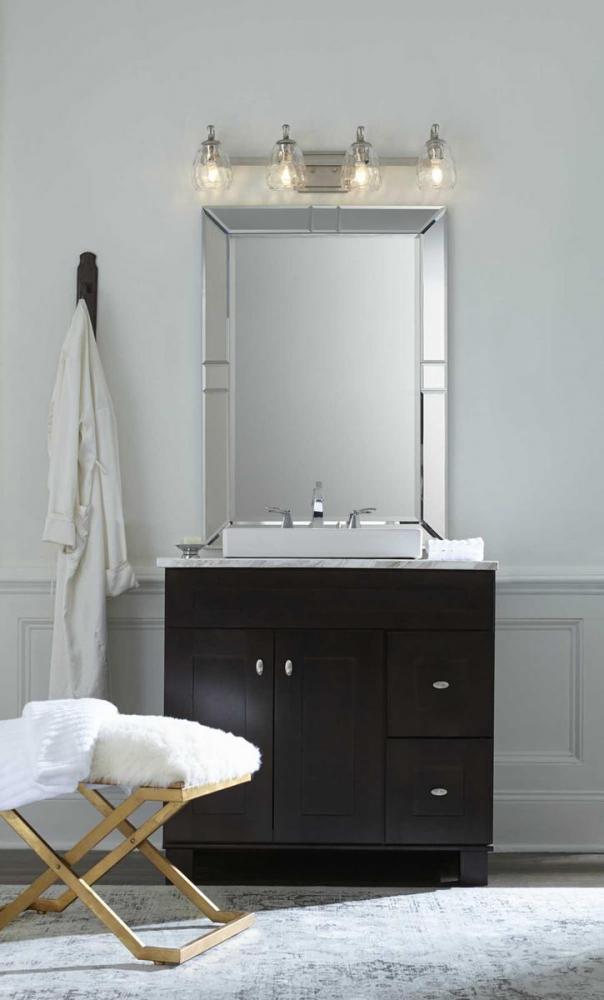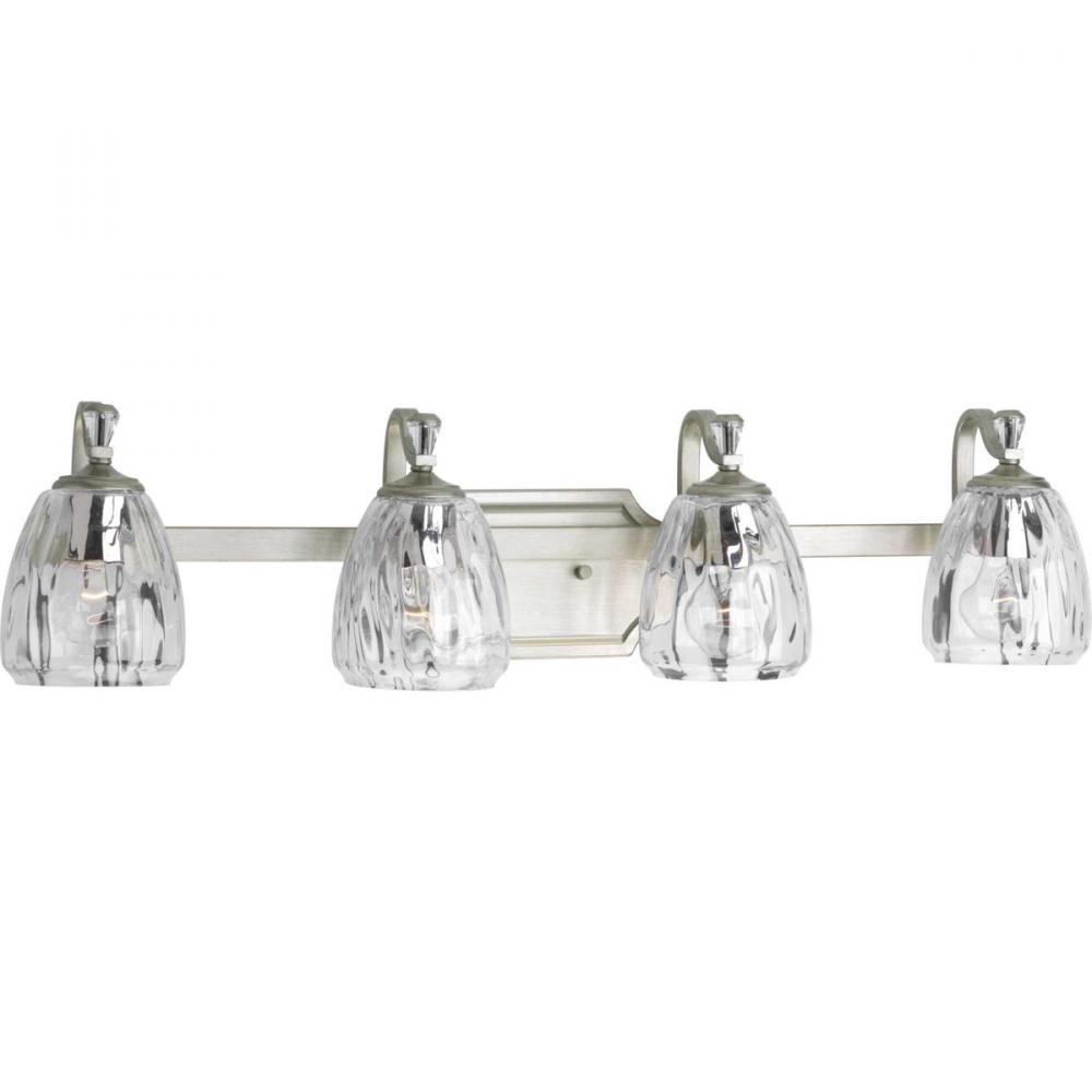 Ideal for a bathroom;Perfect for luxe, new traditional, traditional, and transitional style settings;Sleek silver ridge finish with polished nickel accents;Elegant clear water glass shades;Mount the light fixture facing up or down;Use 4 medium base bulbs t