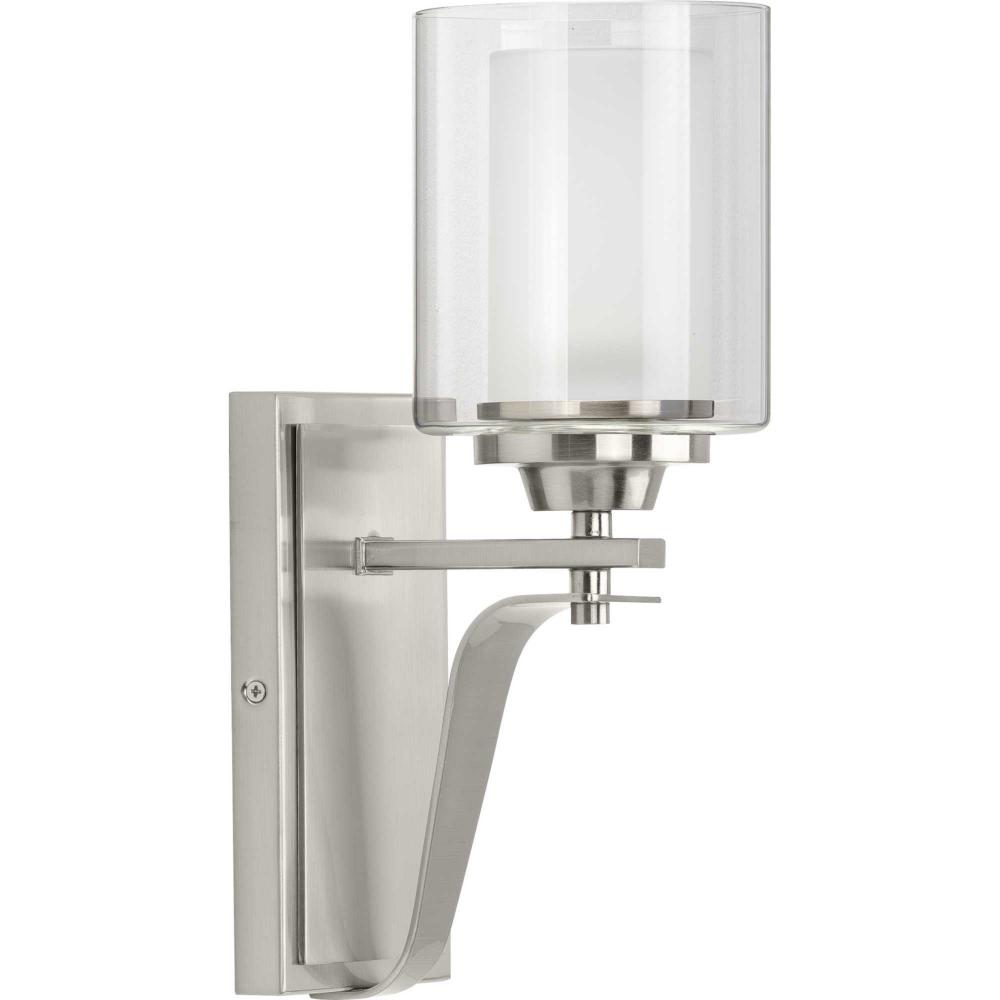 Add A Modern Romance To The Heart Of Your Home With This Lovely Wall Bracket. A Quiet Etched Glass Diffuser Is Surrounded By A Clear Outer Shade For A Soft, Luxurious Touch. The Shades Sit On An Elegant Brushed Nickel Frame With A Rectangular Backplate.