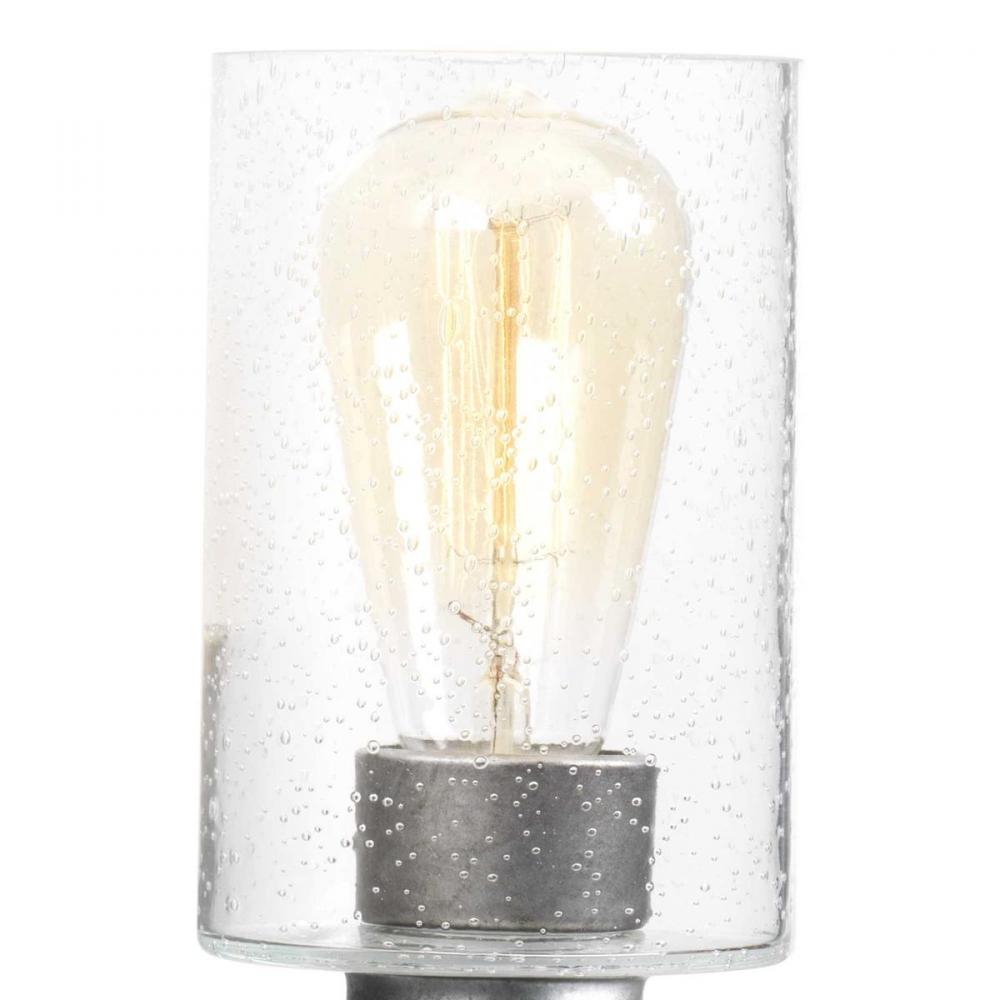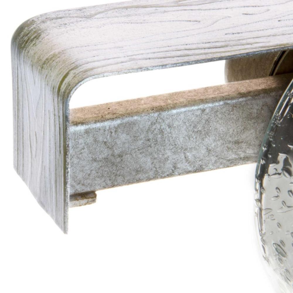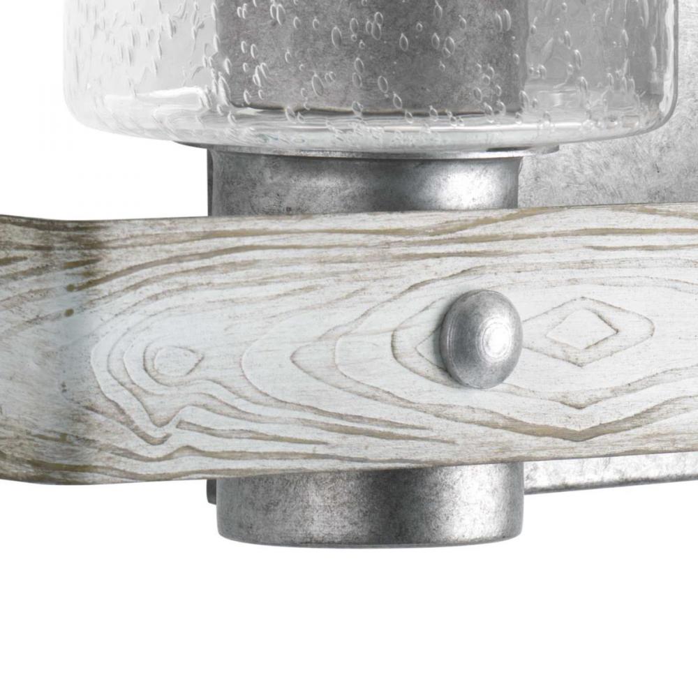 Ideal for a bathroom and powder room.;Perfect for coastal, farmhouse, rustic, and urban industrial style settings;Gorgeous galvanized finish hand painted antique white faux wood accents;Rustic clear seeded glass shades;Mount the light fixture facing up or