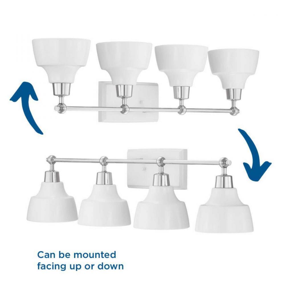 Ideal for a bathroom;Perfect for coastal, farmhouse, and urban industrial style settings;Gloss white with crisp polished chrome accents;Metal reflector-style shades;Mount the light fixture facing up or down;Use 4 medium base bulbs that are sold separately