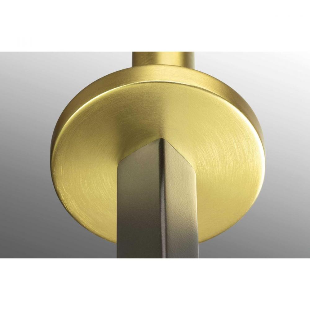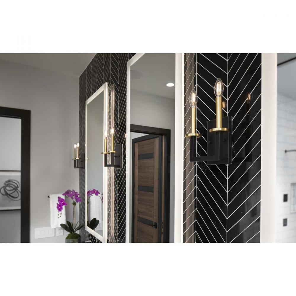 The Blakely collection two-light wall bracket is a fashion-forward design style. Celebrate geometric interplay with clean, straight lines. Finished in Graphite with satin brass accents, the Blakely collection is ideal for Modern and Traditional interiors.