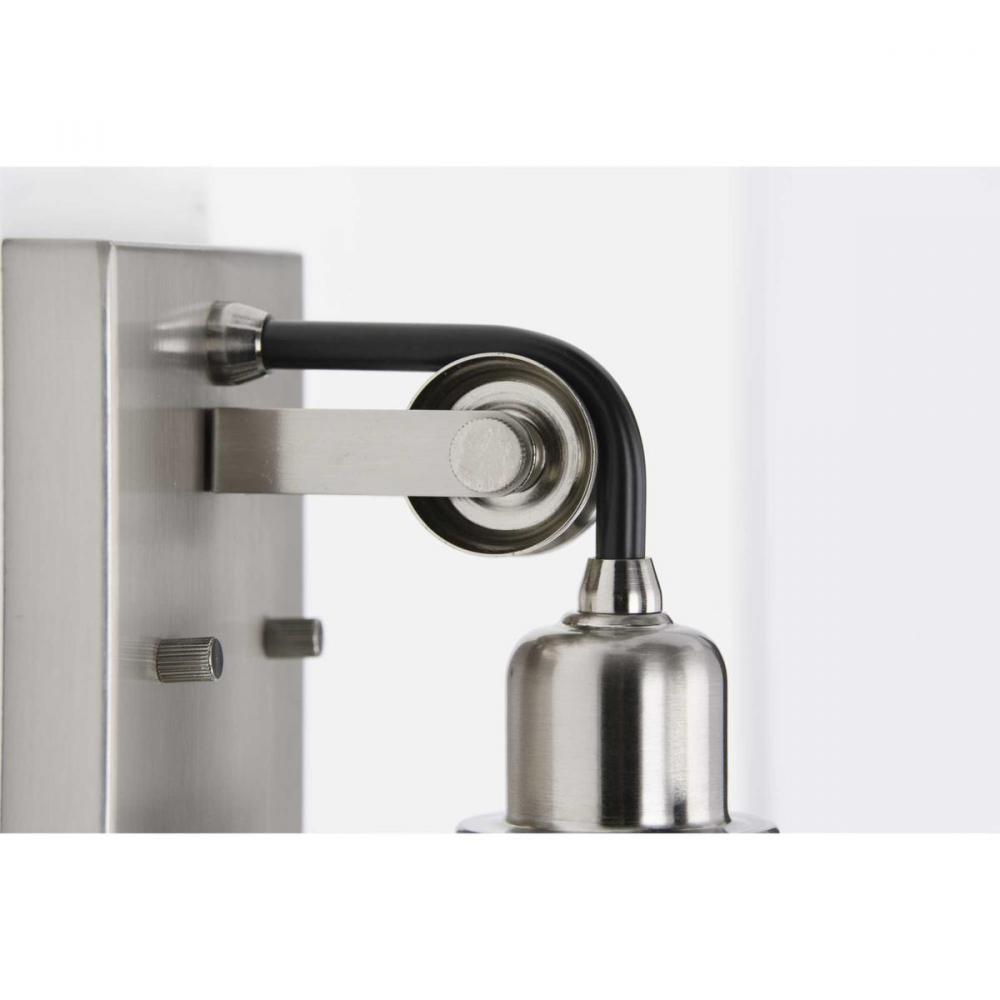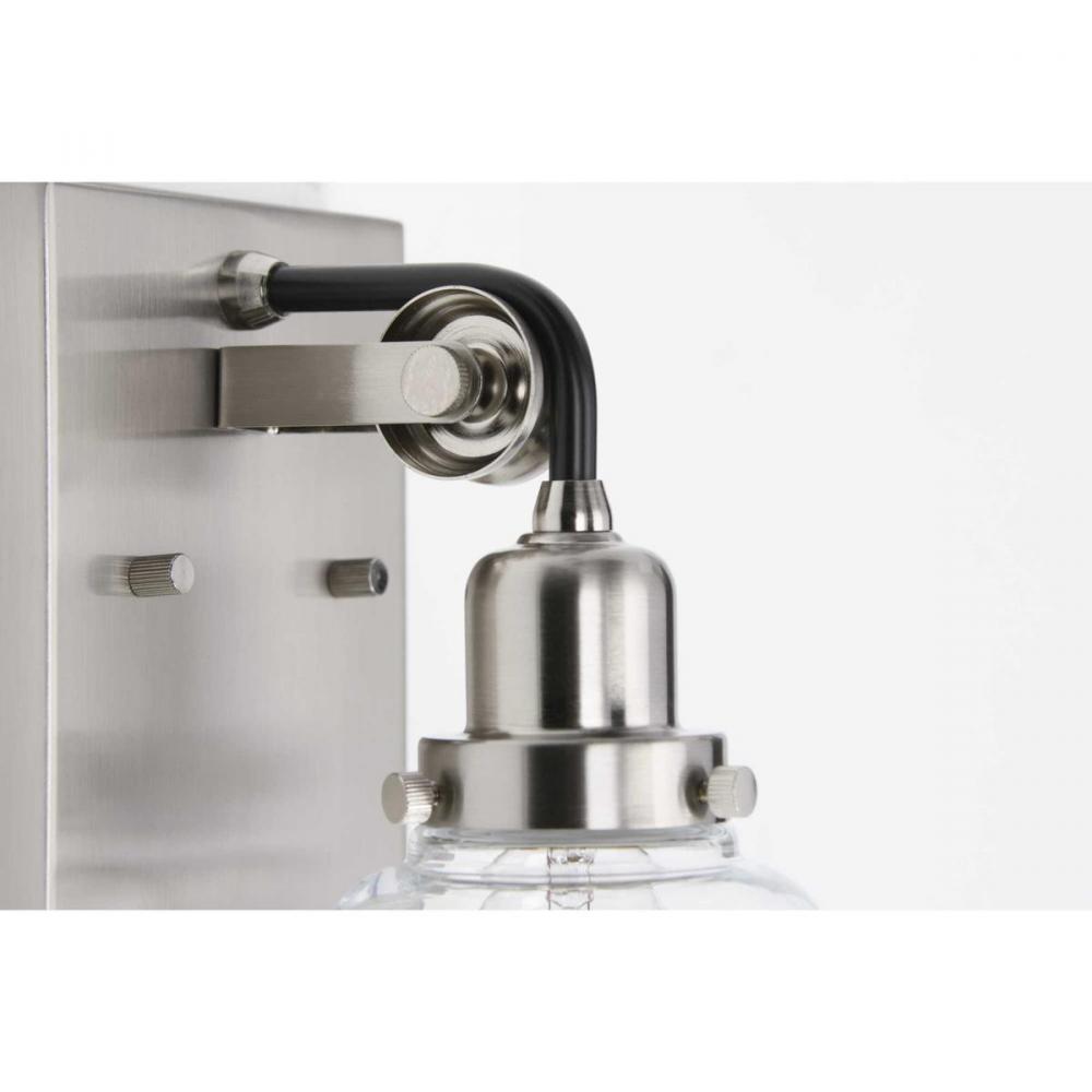 Decorate and add functional lighting to either side of a mirror or throughout the home with the timeless Rushton one-light bath. A single exposed bulb surrounded by a clear glass shade hangs from an antique-style socket. The faux cord extending from the Brushed Nickel backplate wraps around the miniature pulley wheel to create a one-of-a-kind arm to hold the fixture in place. With its tasteful industrial design, this piece is ideal as a bath vanity or wall sconce in industrial and farmhouse settings.