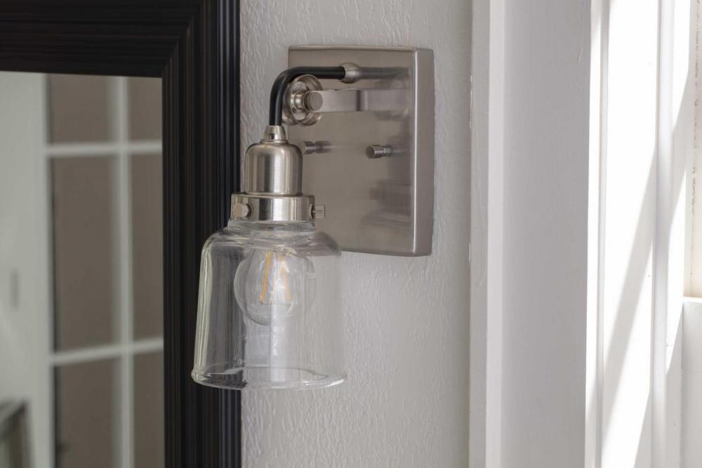Ideal for a bathroom, dining room, hallway, or foyer;Perfect for farmhouse and urban industrial style settings;Beautiful brushed nickel finish;Crisp clear glass shade;Mount the light fixture facing up or down;Use 1 medium base bulb that is sold separately