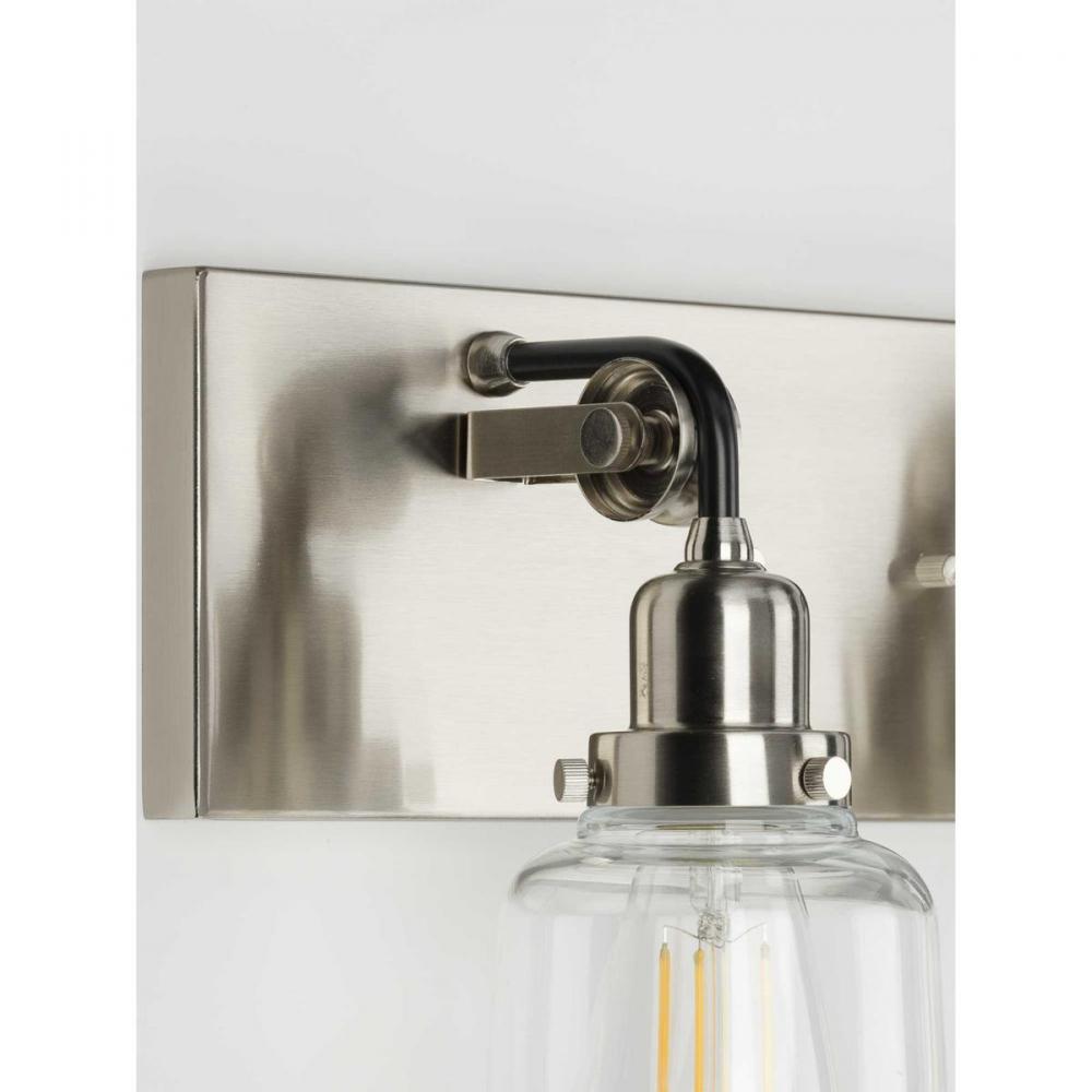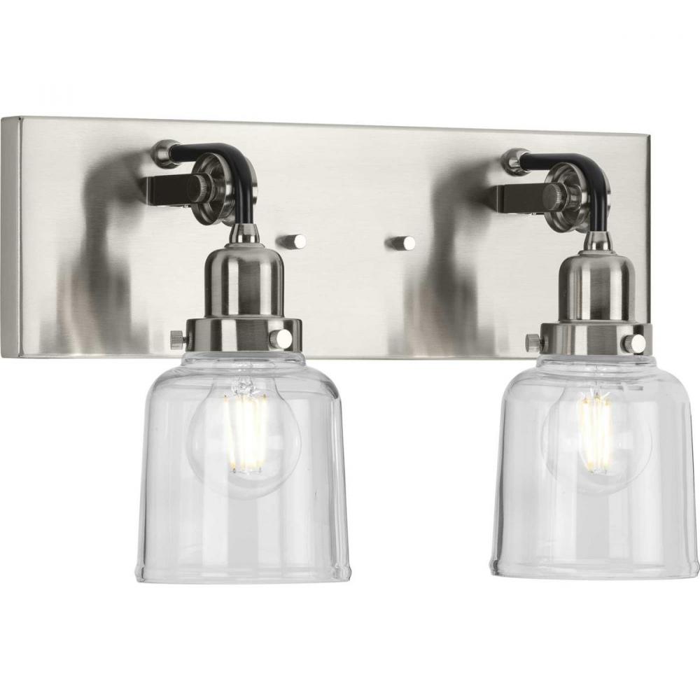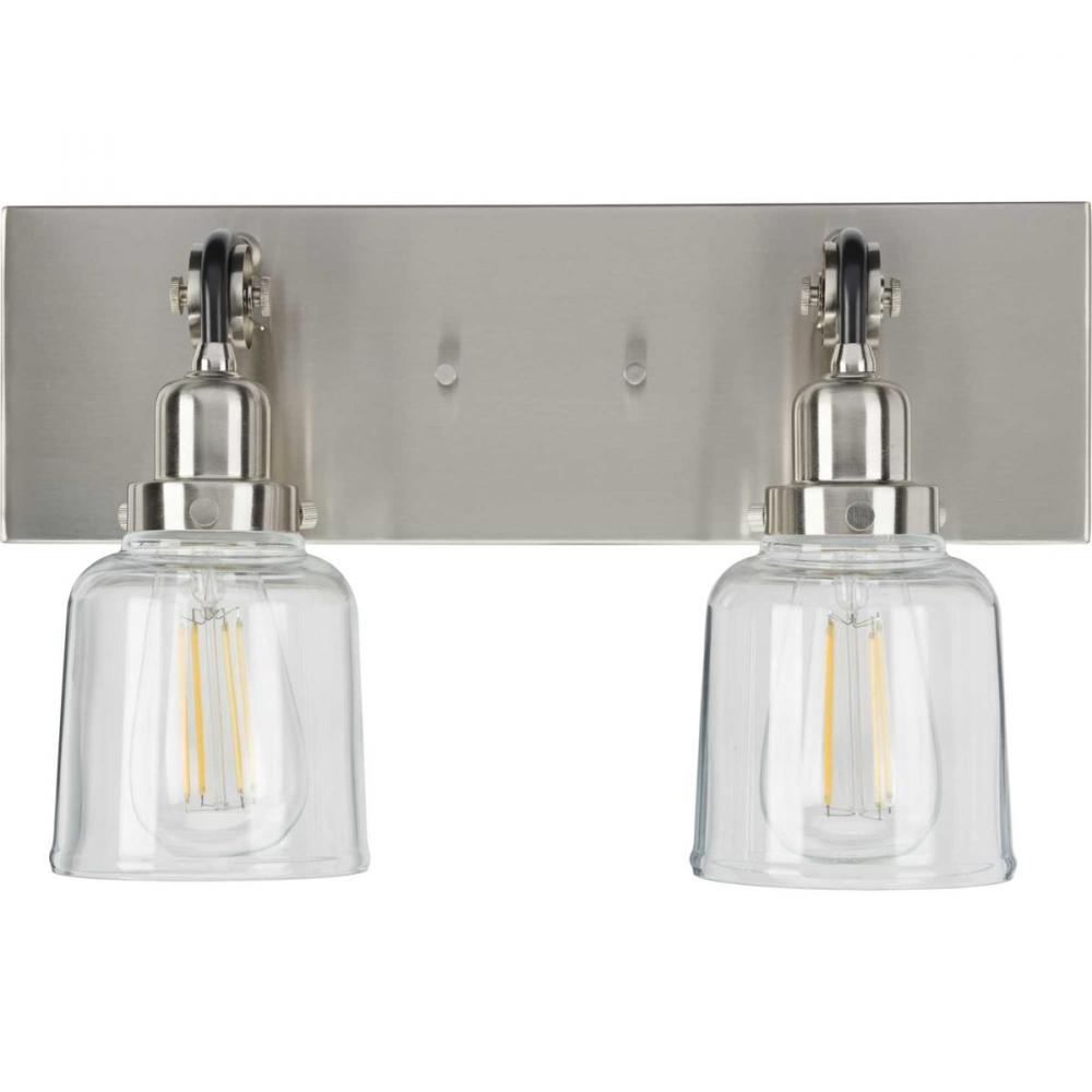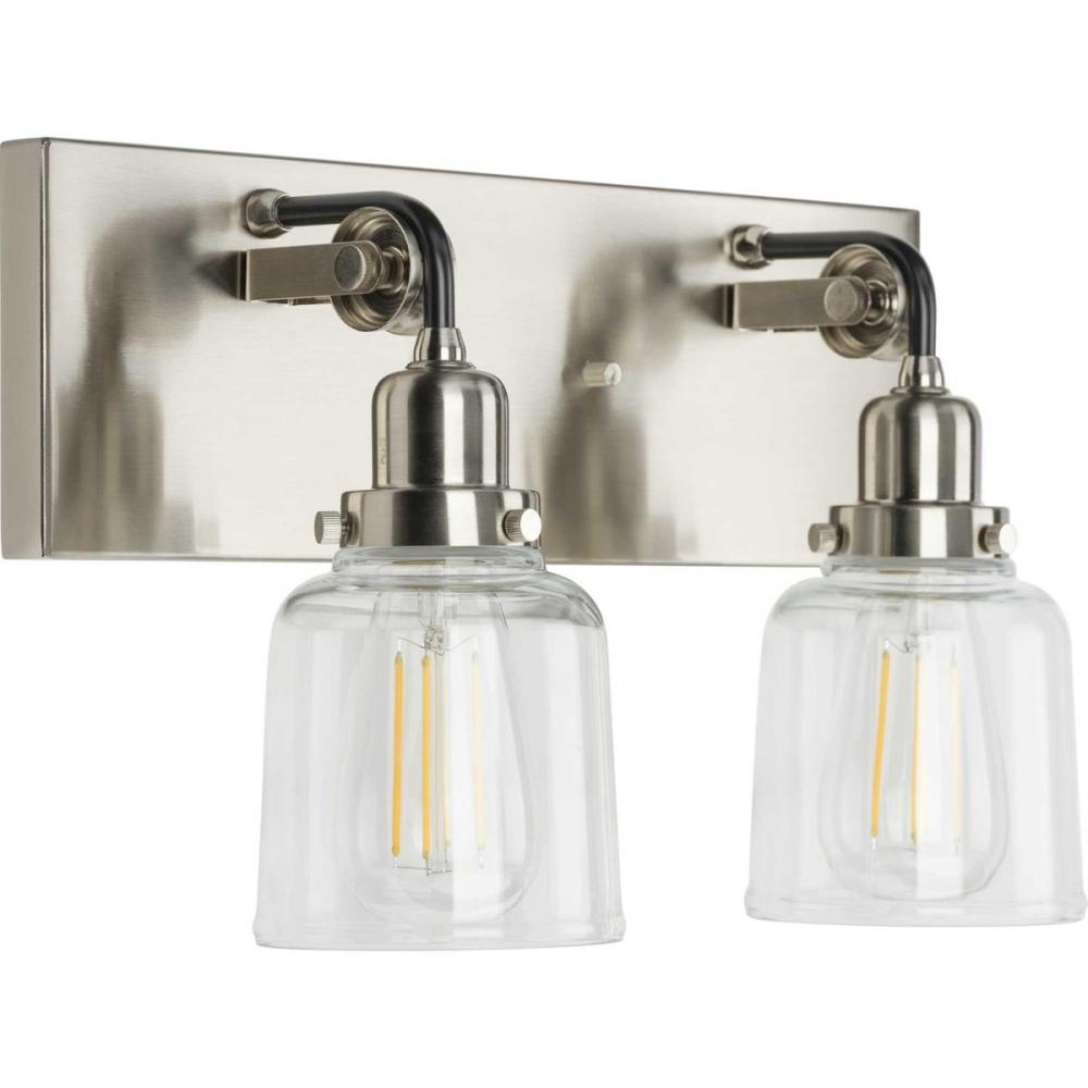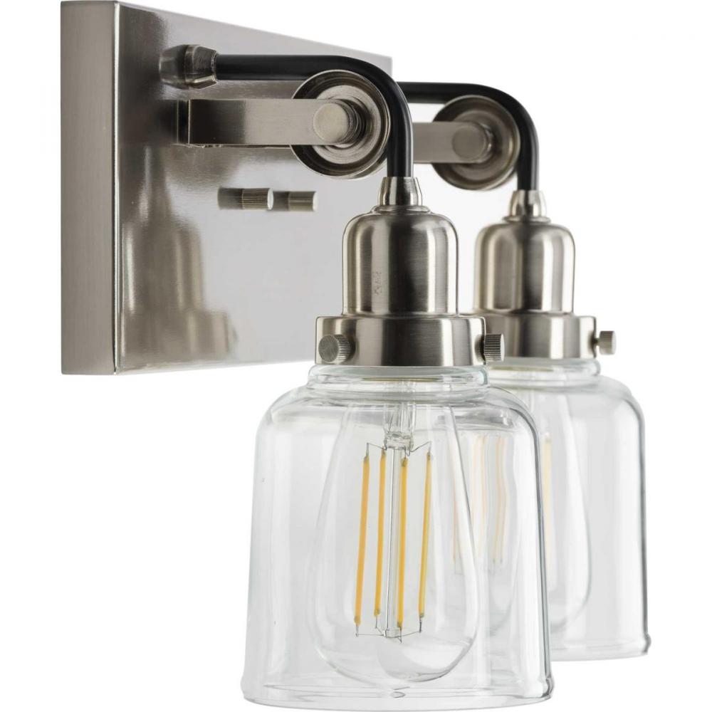 Honor history with the Rushton two-light bath. Two exposed bulbs dressed in clear glass shades make a striking couple as they gracefully hang from antique-style sockets. A square, Brushed Nickel backplate anchors Black tube arms extending over mechanical pulley wheels, bringing history to life as this quintessential piece serves as a bath vanity or wall sconce wherever antique lighting is desired in industrial and farmhouse settings.