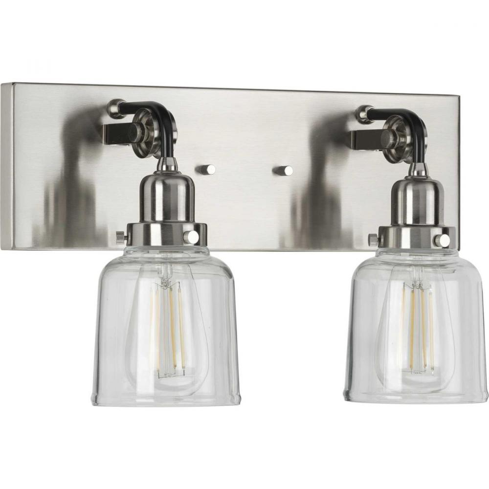 Ideal for a bathroom and powder room.;Perfect for farmhouse and urban industrial style settings;Beautiful brushed nickel finish with black accents;Crisp clear glass shades;Mount the light fixture facing up or down;Use 2 medium base bulbs that are sold sepa