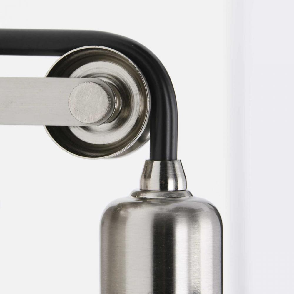 The gorgeous, versatile Rushton three-light bath will feel at home illuminating a bathroom or wall in any industrial and farmhouse setting. A terrific trio of exposed bulbs shine from inside the classic cover of clear glass shades anchored by antique-style sockets. Each bulb dangles from a Black tube arm that stylishly wraps around a mechanical pulley wheel attached to a rectangular, Brushed Nickel backplate for an added pinch of historical elegance.