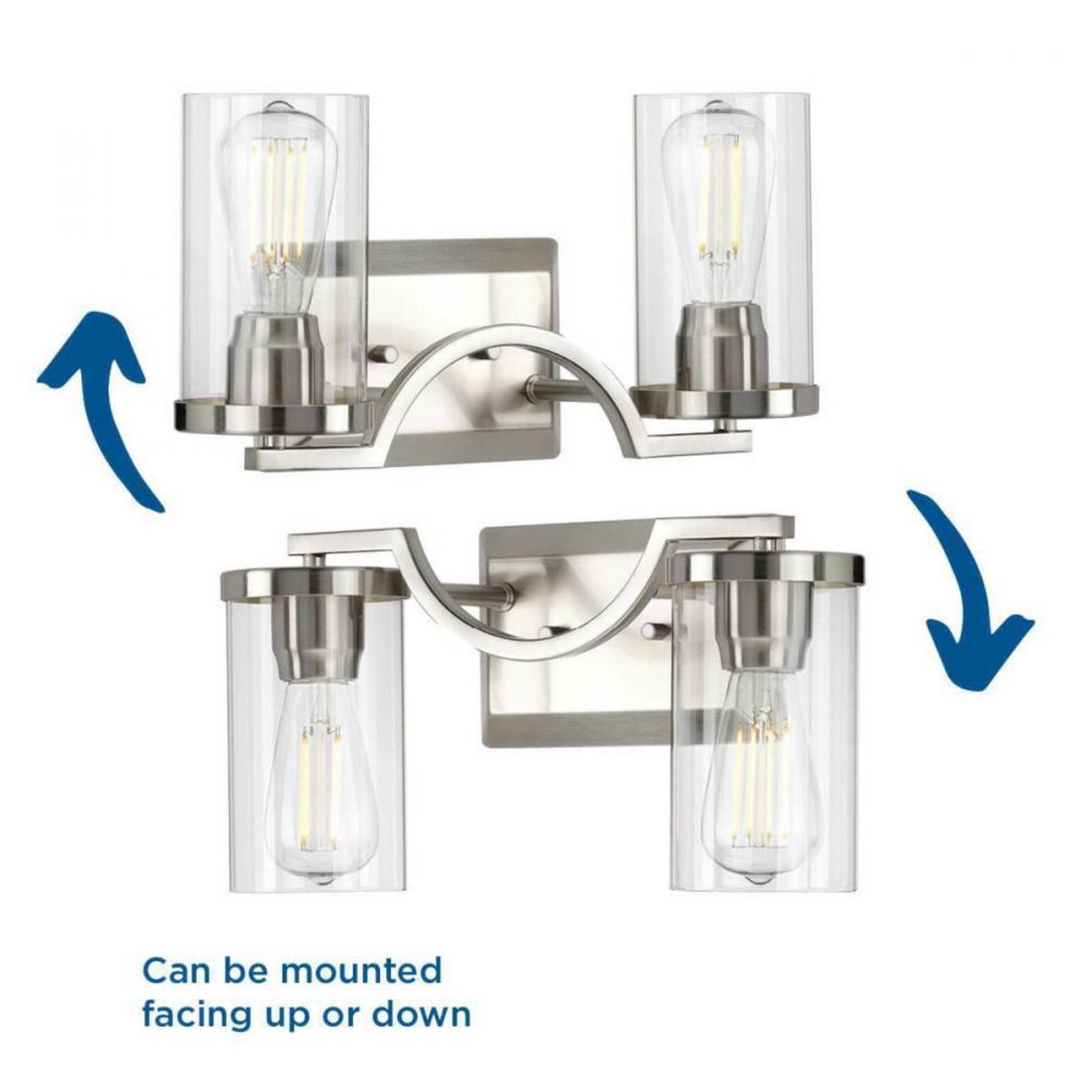 Ideal for a bathroom and powder room.;Perfect for modern, new traditional, and traditional style settings;Beautiful brushed nickel finish;Crisp clear glass shades;Mount the light fixture facing up or down;Use 2 medium base bulbs that are sold separately (6