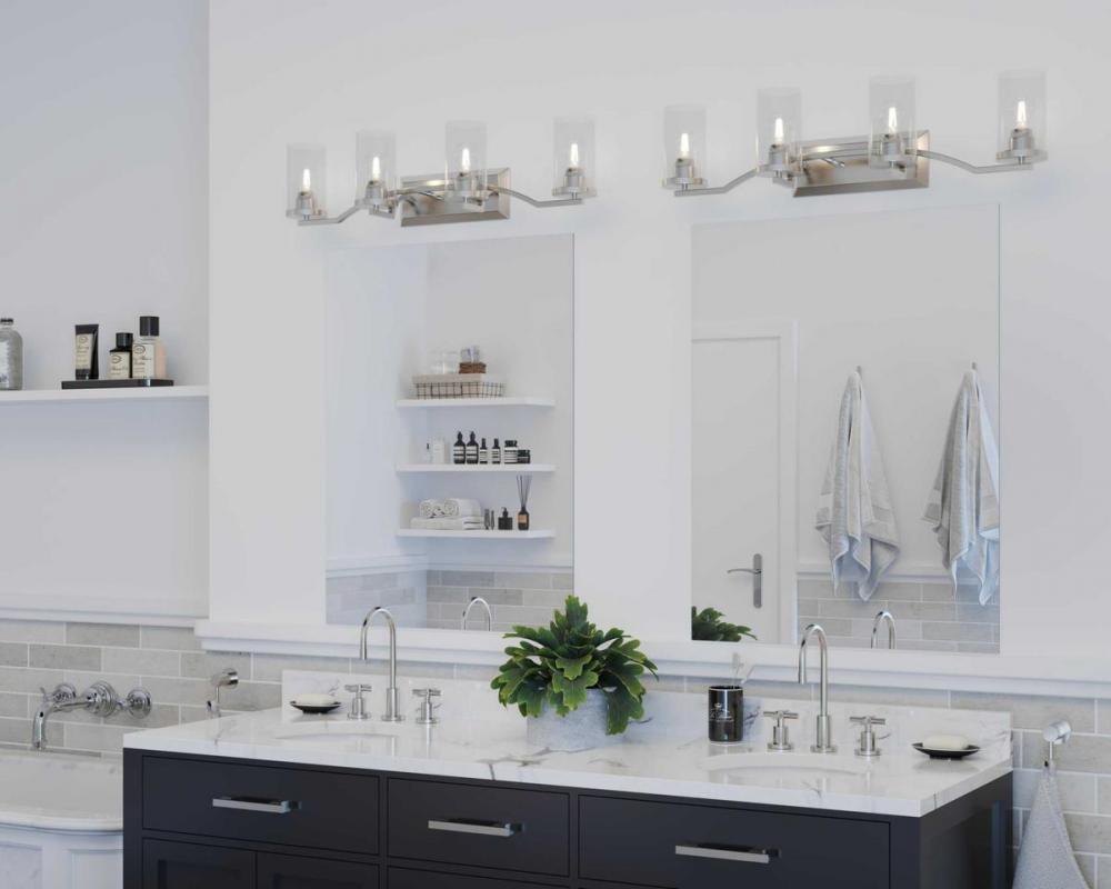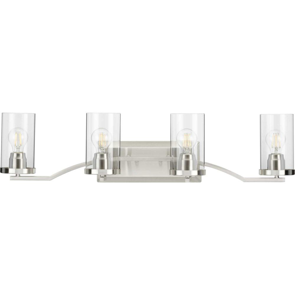 Ideal for a bathroom;Perfect for modern, new traditional, and traditional style settings;Beautiful brushed nickel finish;Crisp clear glass shades;Mount the light fixture facing up or down;Use 4 medium base bulbs that are sold separately (60 W max - LED/CFL
