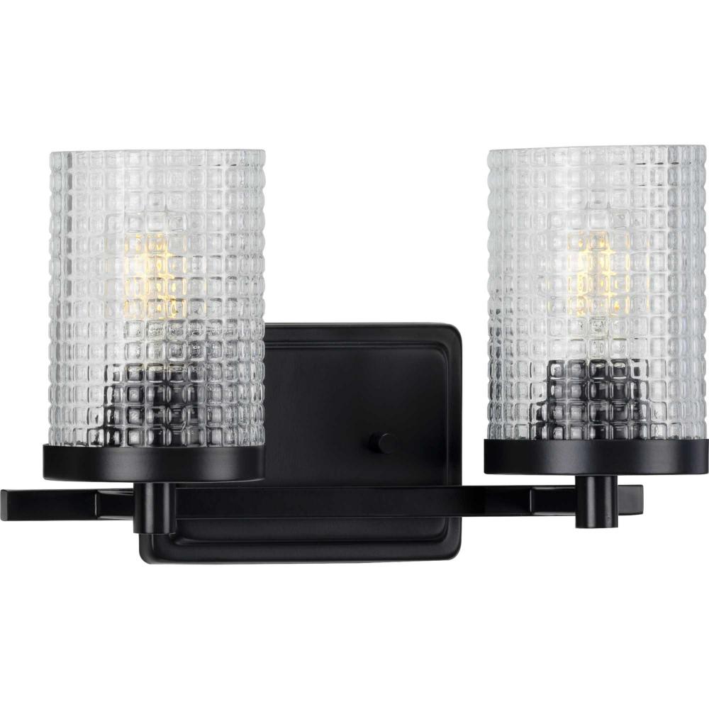 Open The Door To A World Of Modern Elegance With The Clean And Crisp Fawcett Collection Black Two-Light Bath. Signature Clear Patterned Glass Shades Provide A Calming And Relaxing Lighting Experience. Each Shade Is Held In Place By Gentle Backplates Coated In A Beautiful Black Finish.