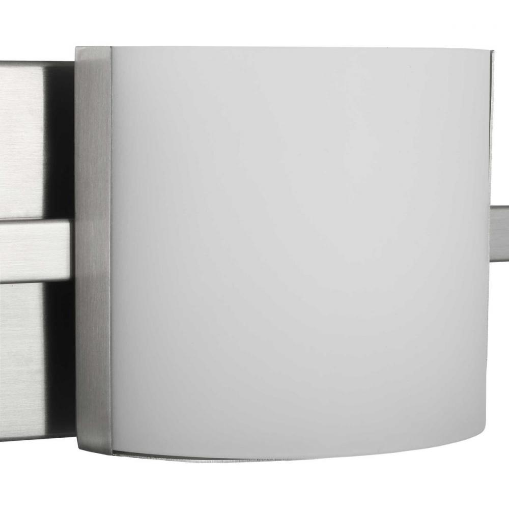 Ideal for a bathroom;Perfect for modern and transitional style settings;Beautiful brushed nickel finish;Elegant etched glass shades;Fixture can mount horizontal and vertical;Includes 3 integrated LEDs (10 W), 1508 lumens, 3000 K, 90 CRI, dimmable;Measures