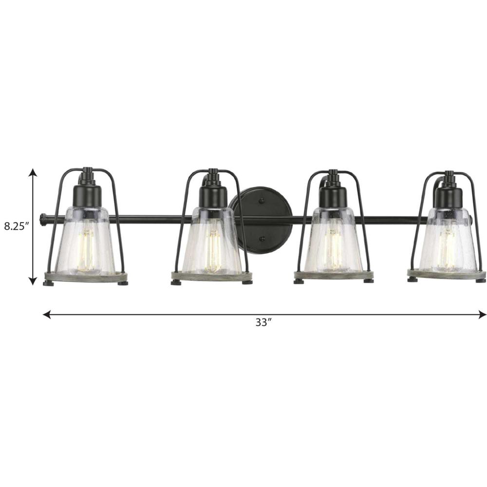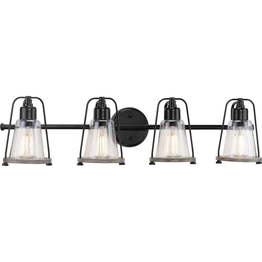 Mix old and new for charming character with the Conway Collection 4-Light Matte Black Clear Seeded Farmhouse Bath Vanity Light. A matte black bell-shaped frame and round backplate are accented by hand-painted, weathered grey wood-style accents for a charming nautical aesthetic. A light source glows from within a clear seeded glass shade for visual texture.