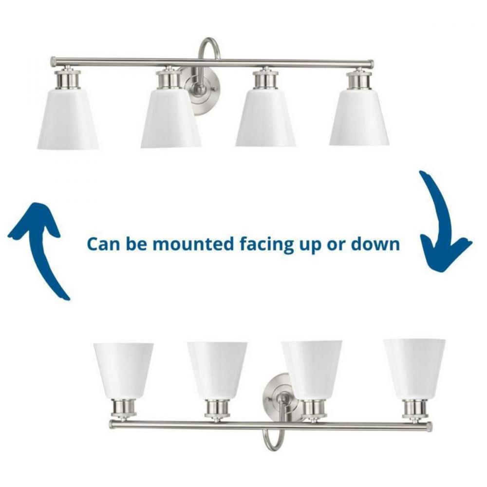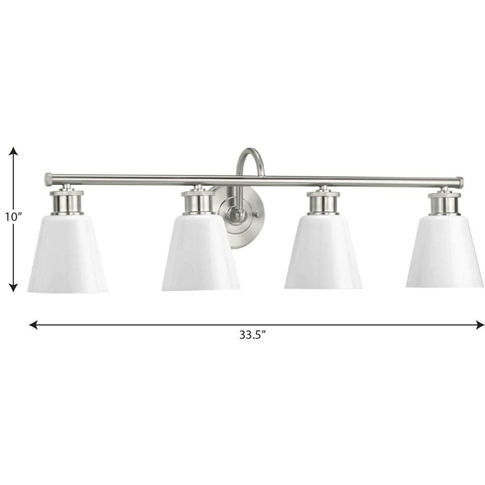 Provide nostalgic charm with the Ashford Collection 4-Light Brushed Nickel Opal Glass Farmhouse Bath Vanity Light. The circular backplate, elegantly curved arms, and vintage light bases are coated in a beautiful brushed nickel finish for a crisp aesthetic. Light sources glow from inside opal glass shades that skillfully blend the old with the new.